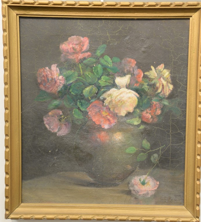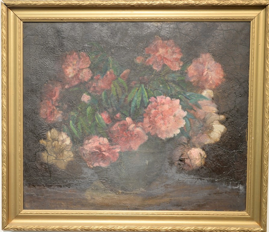 Charles Ethan Porter 1847-1923, oil on canvas, Still Life of Peonies and Roses in a Large Vase, signed lower right: C.E. Porter, fire/smoke damage to surface, 25 x 30, Literature: The Connecticut Gallery, Inc., Charles Ethan Porter, p.96, fig. 51 left wall