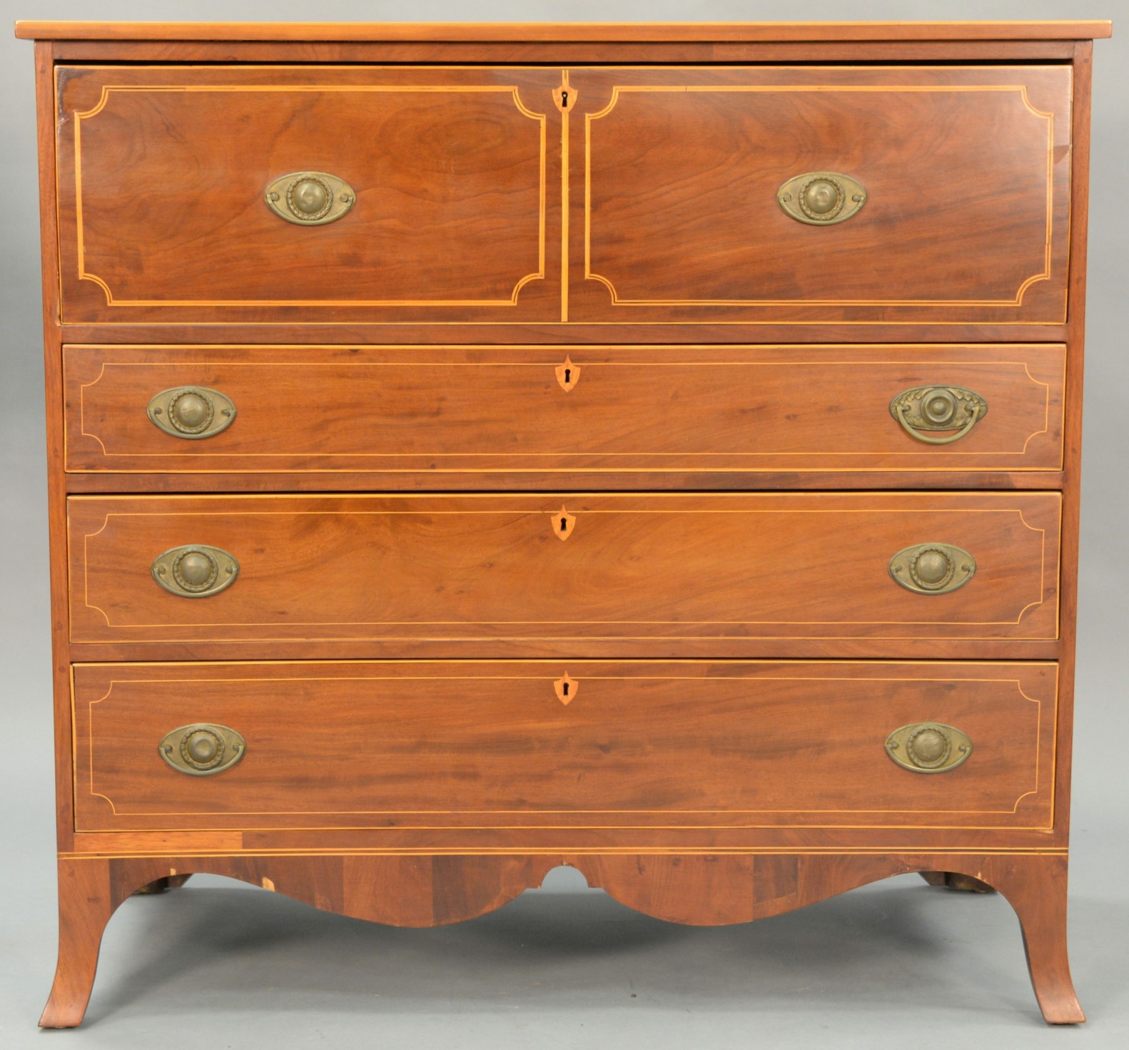 Federal cherry butler’s desk having pull down top drawer opening to reveal drawers, door, and pigeon holes with felt writing surface over three drawers, all set on flaring French feet, circa 1790. ht. 43 in. wd. 44 in. dp. 20 in.