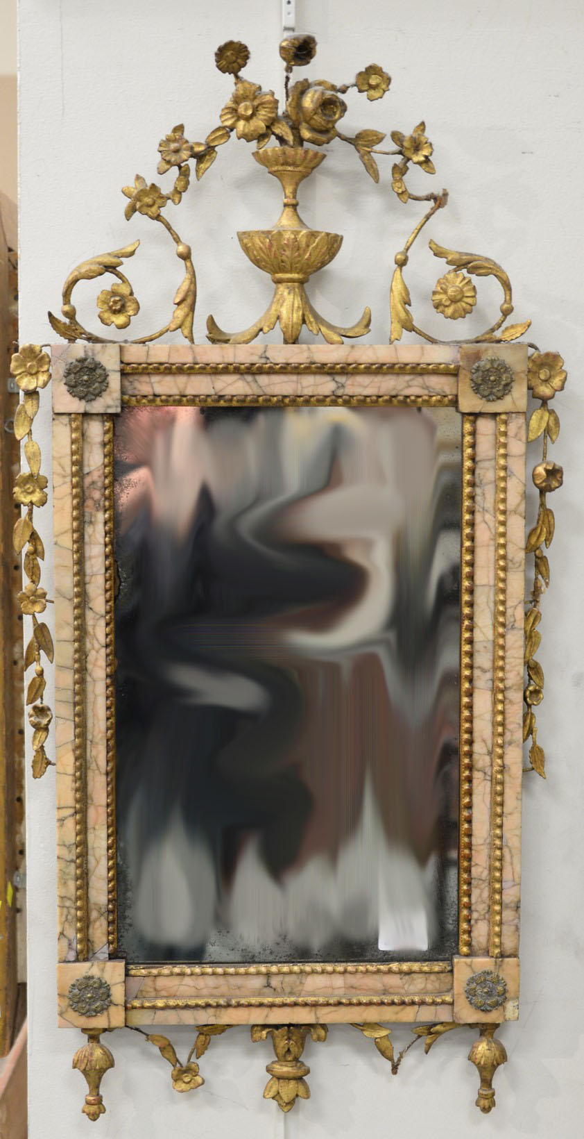 Neoclassical gilded-gesso wood and pink marble veneer Bilbao mirror having tall flower filled urn crest flanked by scrolling floral vines over rectangle mirror flanked with tapered columns over draped floral brackets, Spanish or Portuguese circa 1790-1800. Being sold with Israel Sack original receipt 1988. Photographed in American Antiques From Israel Sack Collection Vol IV, pg. 1089. 43 x 19 Provenance: The Estate of Sylvia Leven