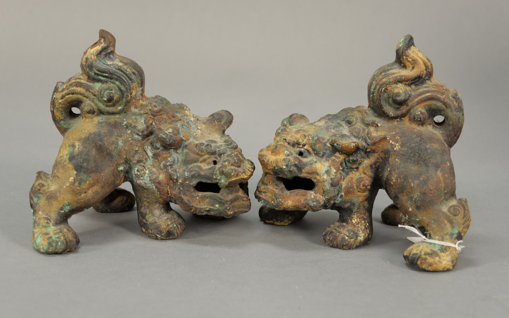 Three Oriental pieces to include large heavy brass censor on triple figure foot base and a foodog finial, a bronze vase, and a footed bowl with lion head handles and seal mark on bottom. ht. 4 1/2 in. ht. 9 1/2 in. ht. 13 in.