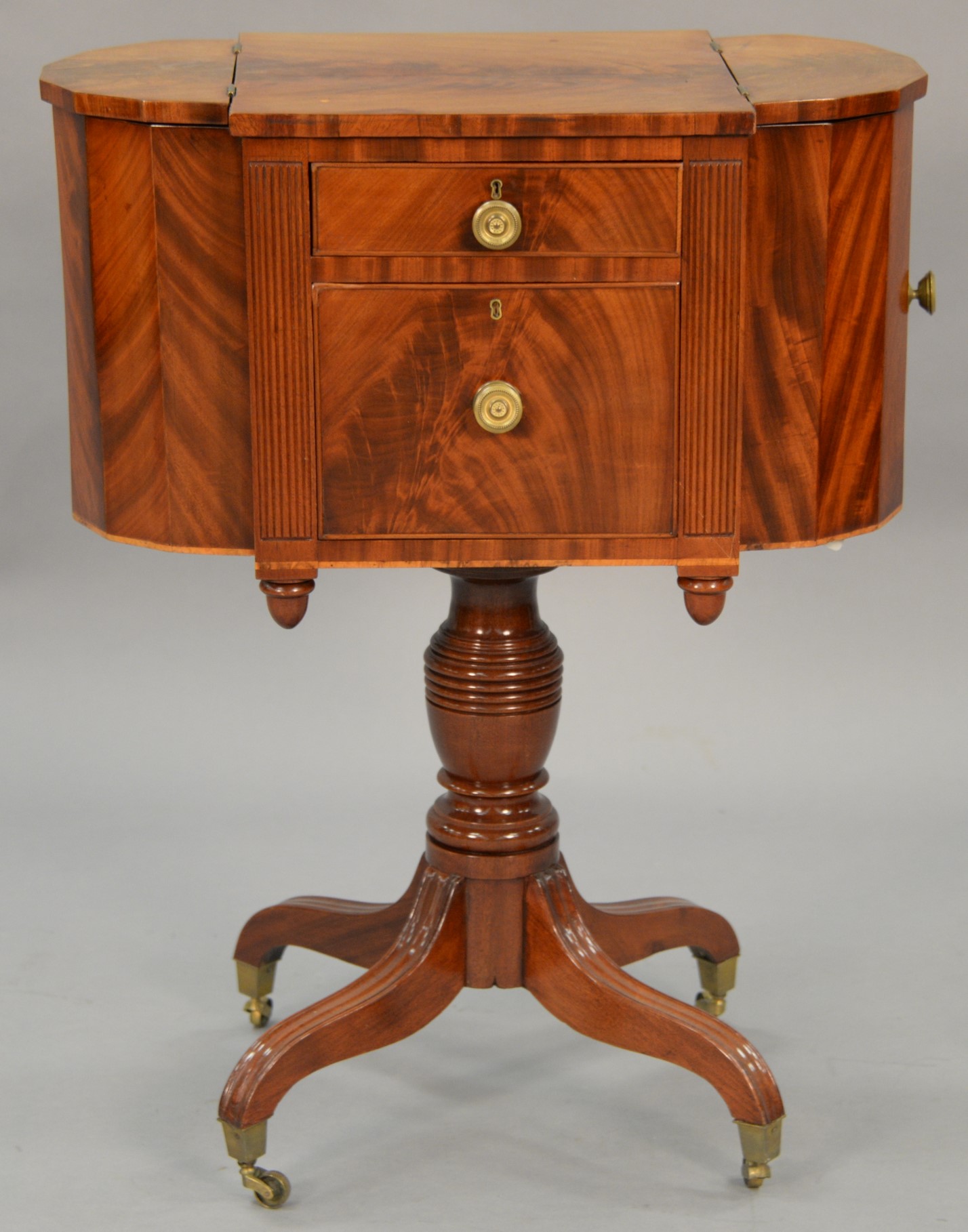 Duncan Phyfe mahogany sewing cabinet having square center top with lift top side cabinets and two drawers flanked by fluted pilasters with four carved drop acorns all set on turned pedestal on four fluted downswept legs ending in brass capped feet with wheels, mahogany and tulip poplar, New York circa 1830-1840. ht. 31 in. wd. 24 in. dp. 13 1/2 in. Provenance: Property from Credit Suisse’s Americana Collection