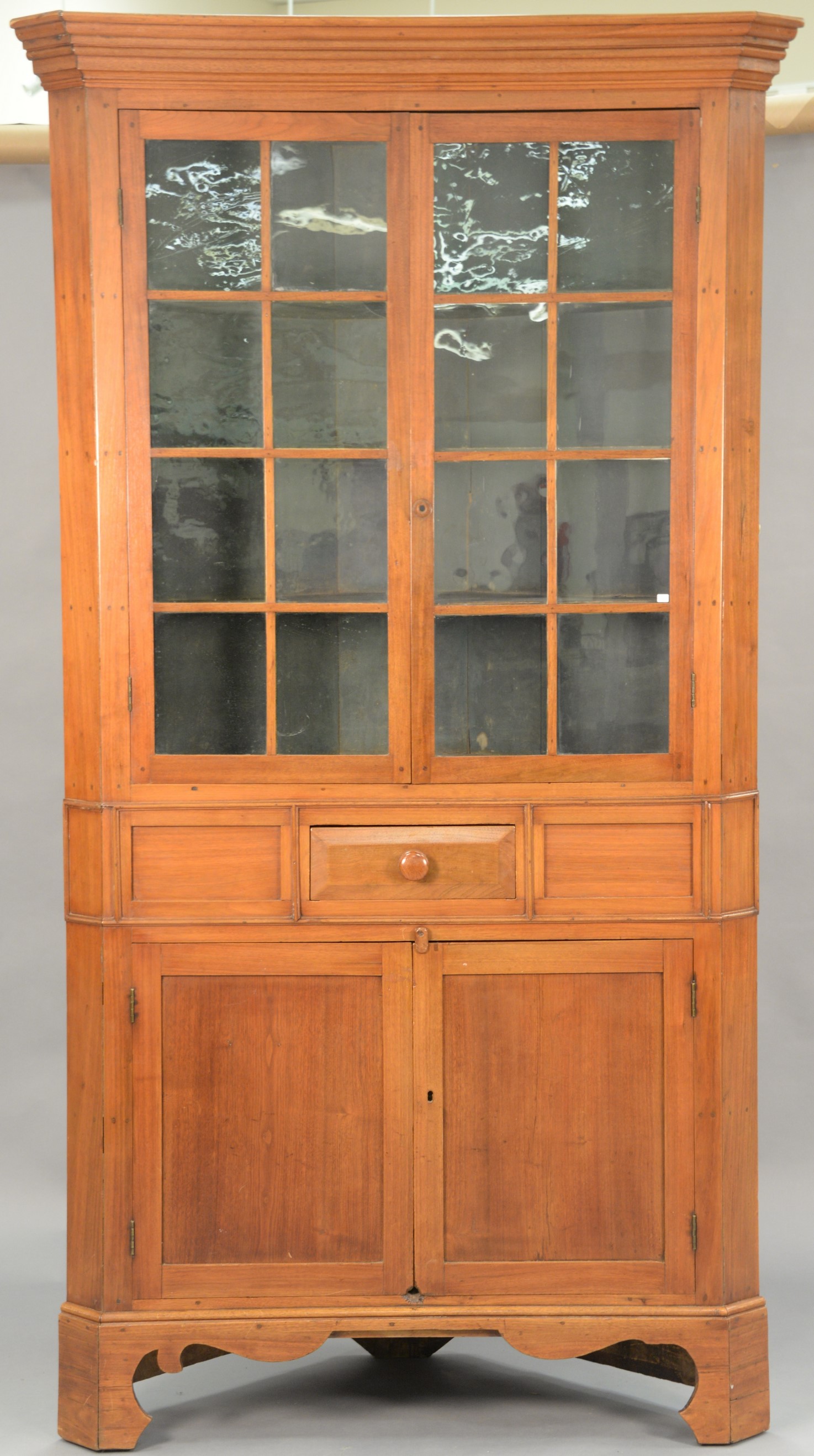 Walnut corner cabinet having stepped cornice molded top over two glazed doors over one drawer over two doors set on cut out bracket feet, 18th century. ht. 95 in. wd. 48 in. dp. 14 in.