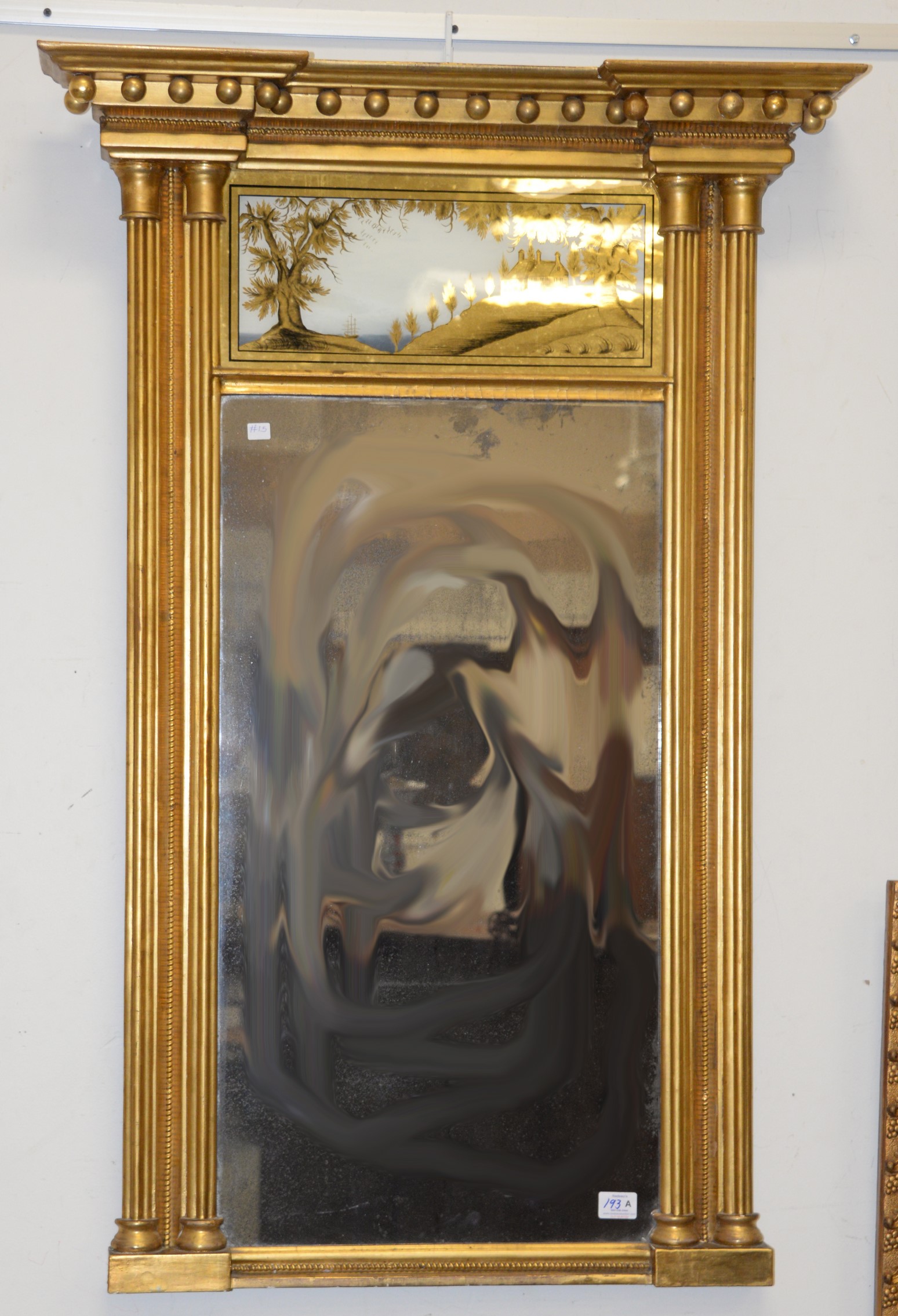 Federal gilt mirror having cornice top with drop ball decoration over eglomise panel of colonial home on hill, all flanked by fluted columns, New York or Boston, circa 1810. ht. 47 in. wd. 32 1/2 in.