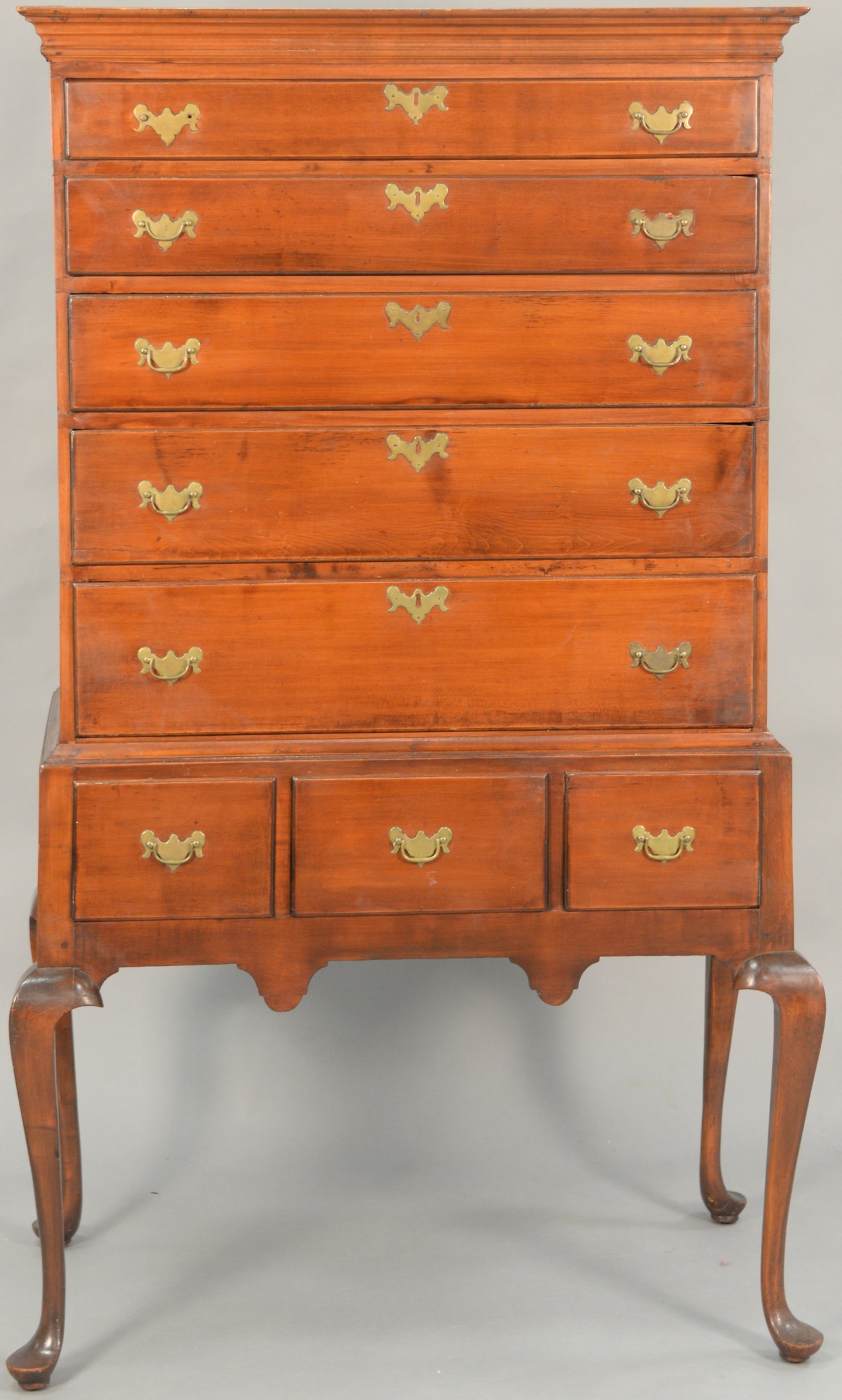 Queen Anne cherry highboy in two parts with cornice molded top over five drawers on lower portion with three short drawers all set on cabriole legs ending in pad feet married. ht. 69 in. wd. 36 in. dp. 20 1/2 in. Provenance: The Estate of Natalie Rafferty