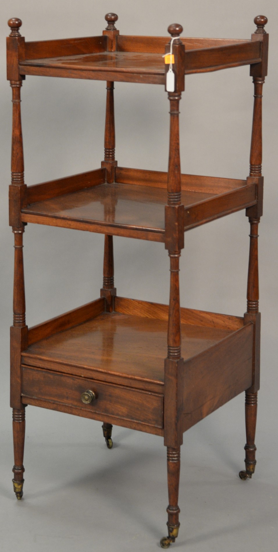 George III mahogany etagere having three shelves and one drawer on turned legs with brass capped wheels, 19th century. ht. 43 1/2 in. wd. 16 1/2 in. dp. 16 1/2 in. Provenance: The Estate of Natalie Rafferty