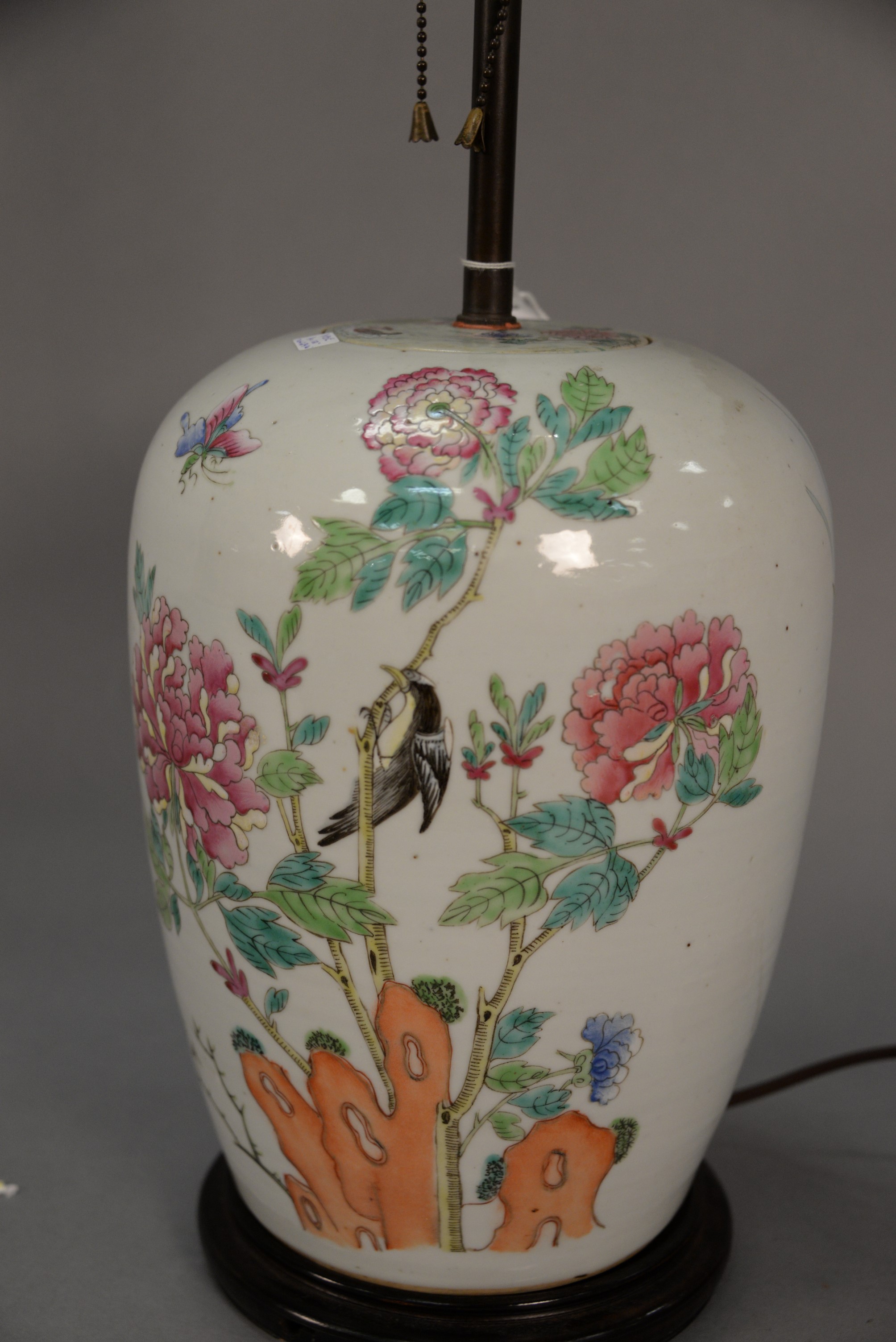 Famille Rose porcelain covered ginger jar with enameled ducks amongst blossoming lotus, made into a table lamp repair to top. vase ht. 12 in. total ht. 25 in.