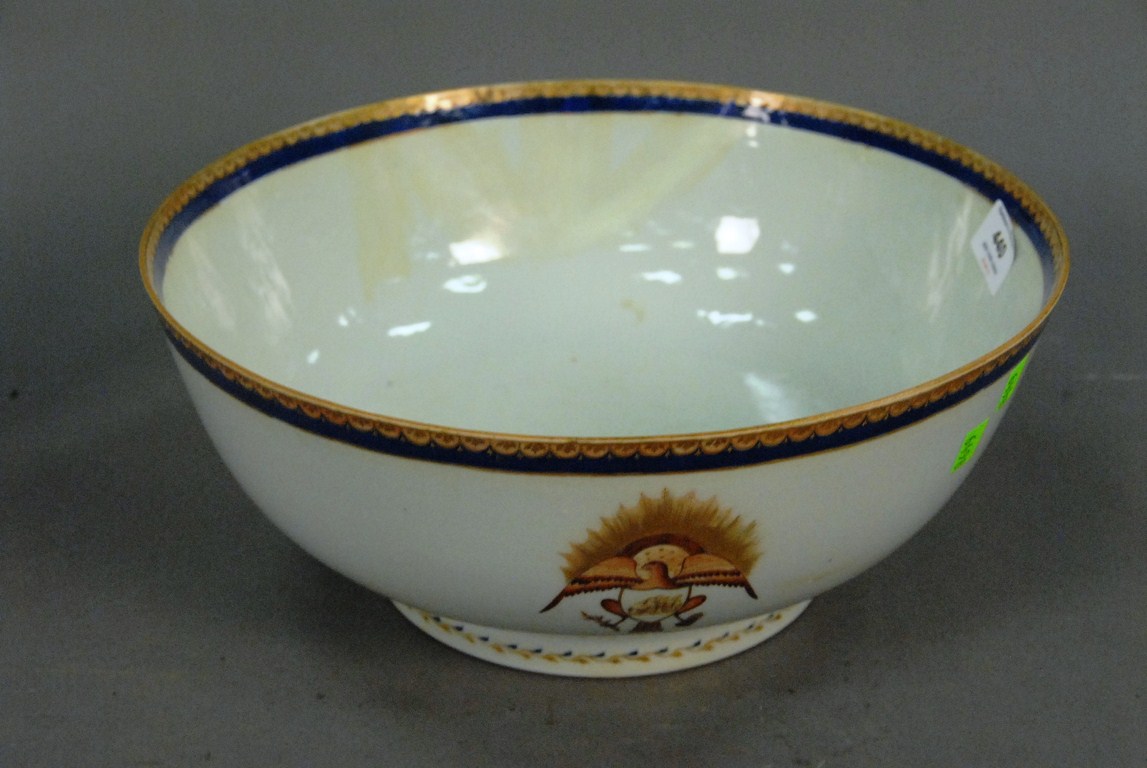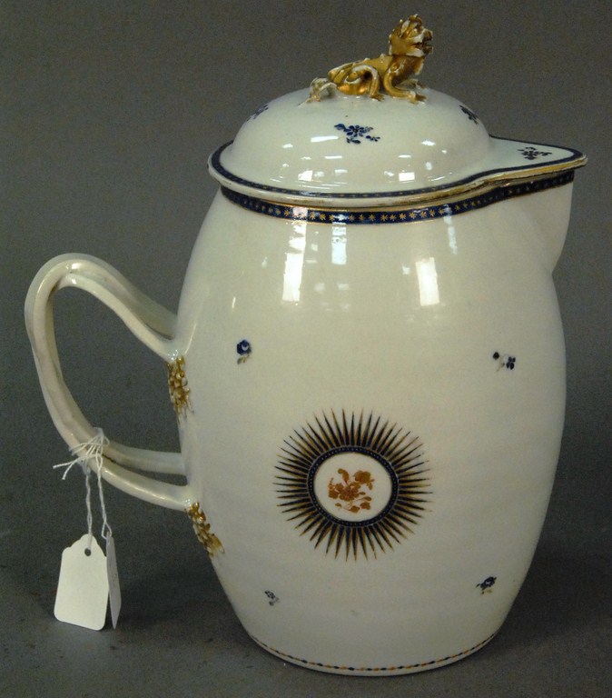 Early Chinese porcelain cidar jug made for the western market, cover with gilt foodog finial and the cover and body with cobalt and gilt decoration, late 18th early 19th century repaired. ht. 11 1/2in.