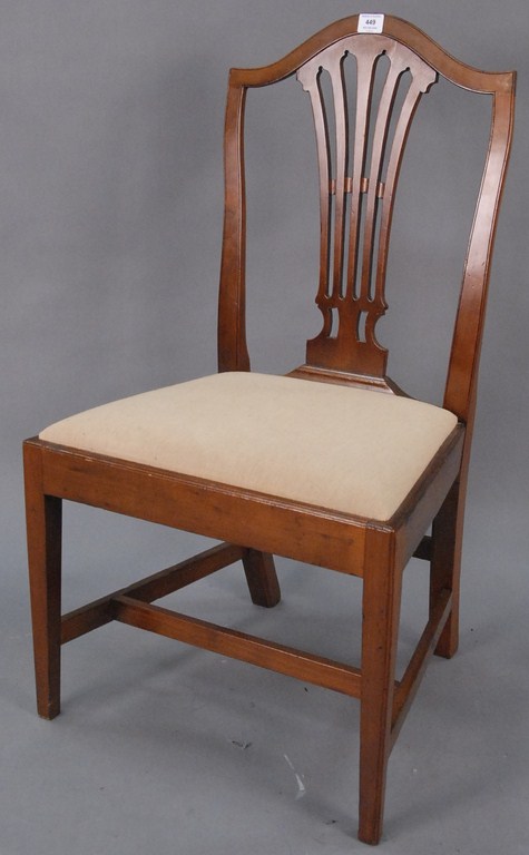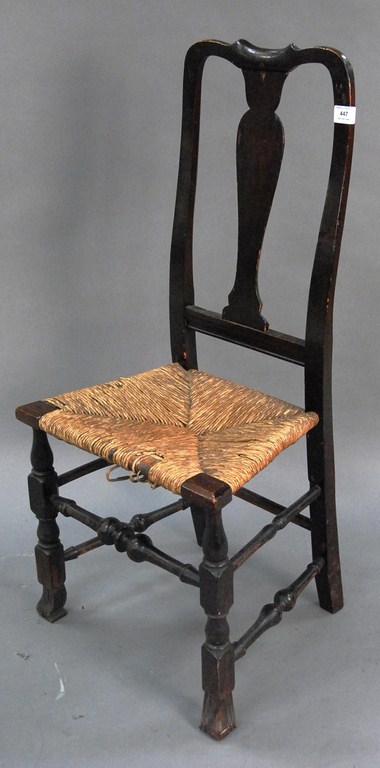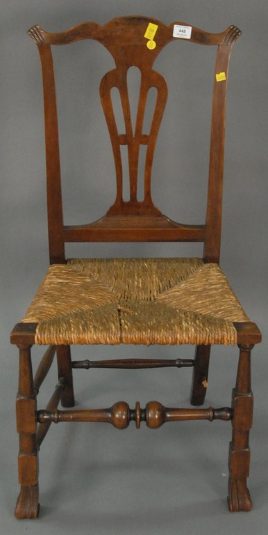 Queen Anne side chair with pierced carved back, rush seat, bold turned front stretcher on Spanish feet two side stretchers missing. Provenance: Estate of Judy McDonough Gengras of Stoner Drive, West Hartford, Connecticut.