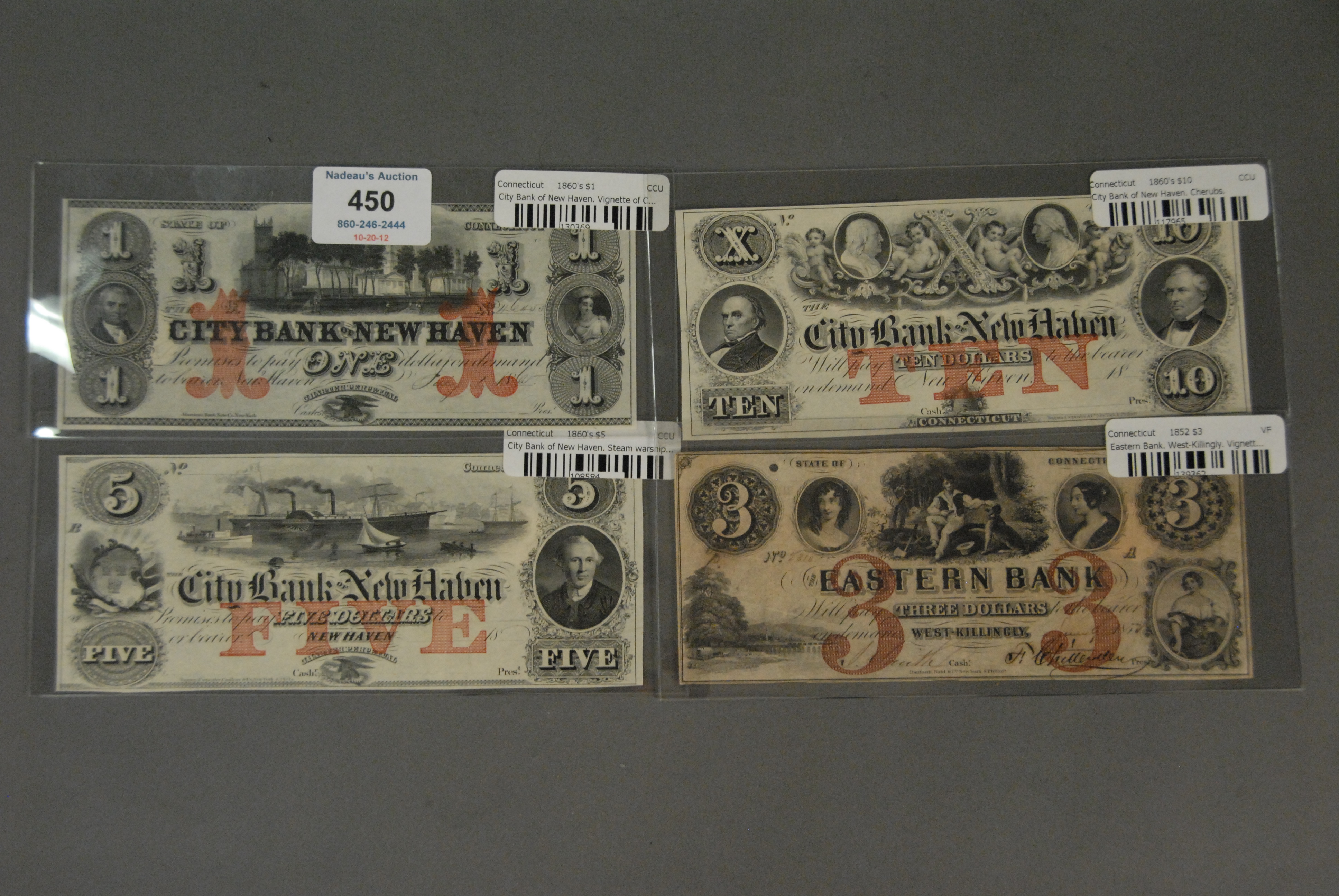 Four piece lot of large bills 1.00 City Bank, N.H. CT 1860, 5.00 City Bank N.H. CT 1860, 10.00 City Bank N.H. CT 1860, and 3.00 Eastern Bank Killingly CT 1852.