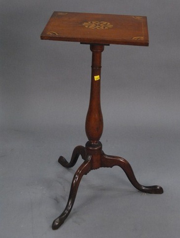 Federal cherry candlestand with inlaid square top on slender turned shaft and tripod base. ht. 29in. top: 14 x 15. Provenance: Estate of Judy McDonough Gengras of Stoner Drive, West Hartford, Connecticut.