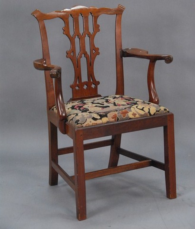Chippendale mahogany armchair with pierce carved back, scrolled hand rests, and slip seat on squared legs, 18th century. seat ht. 20in. back ht. 38in. Provenance: Estate of Judy McDonough Gengras of Stoner Drive, West Hartford, Connecticut.