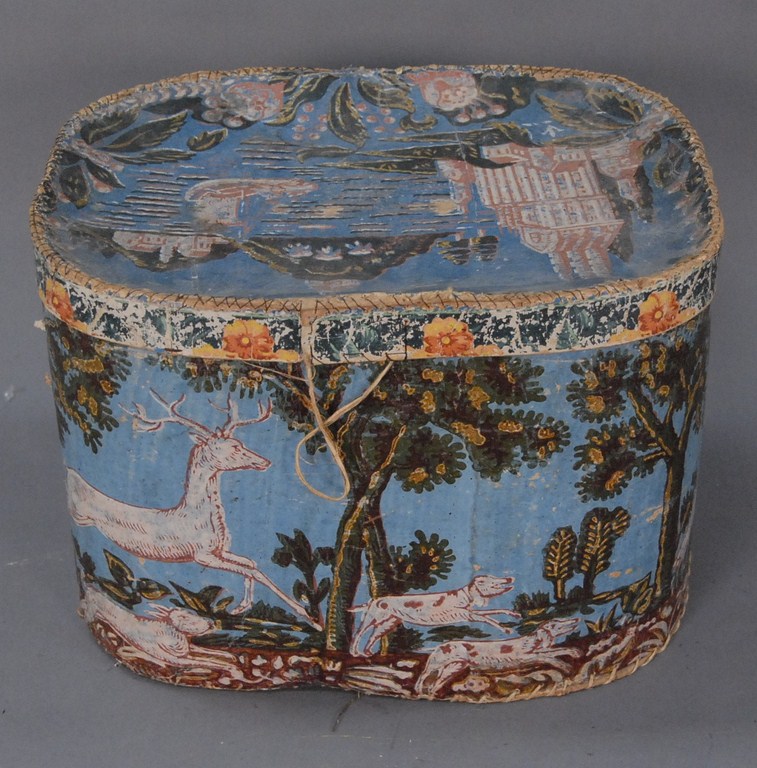 Wallpaper box with dogs chasing rabbits, and stags, sky blue decorated with buildings. ht. 11 1/2in. lg. 16in. wd. 12 1/2in. From the collection of Thomas and Alice Kugelman