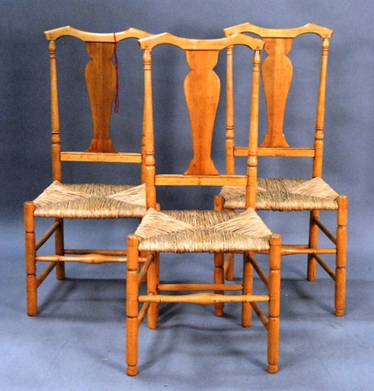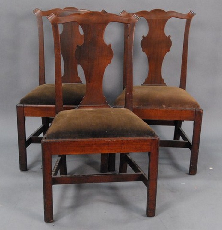 Set of three Chippendale mahogany side chairs with shaped splats and slip seats on squared legs, 18th century one piece of one splat missing. Being sold for a Museum in Connecticut.