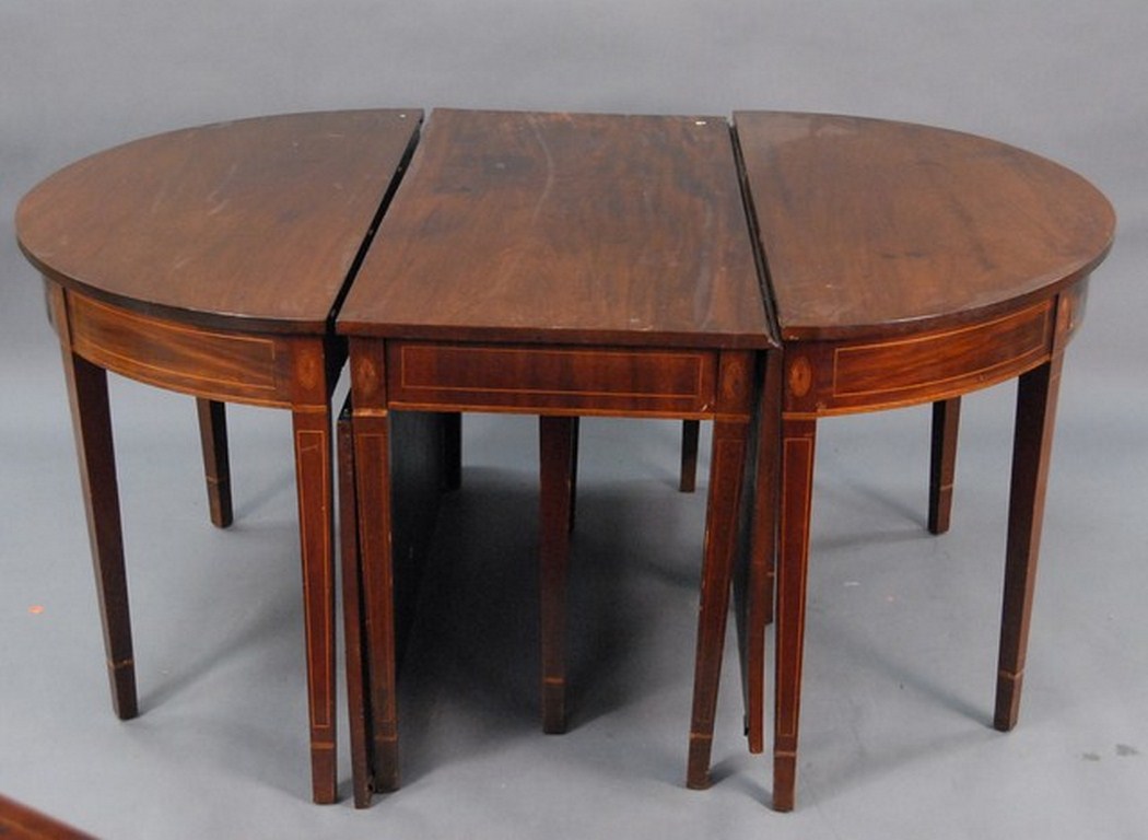 Federal mahogany three part dining table with panel and line inlays having two drop leaves and two additional leaves. ht. 29in. closed: 63 x 48 total open: 48 x 147. From the collection of Thomas and Alice Kugelman
