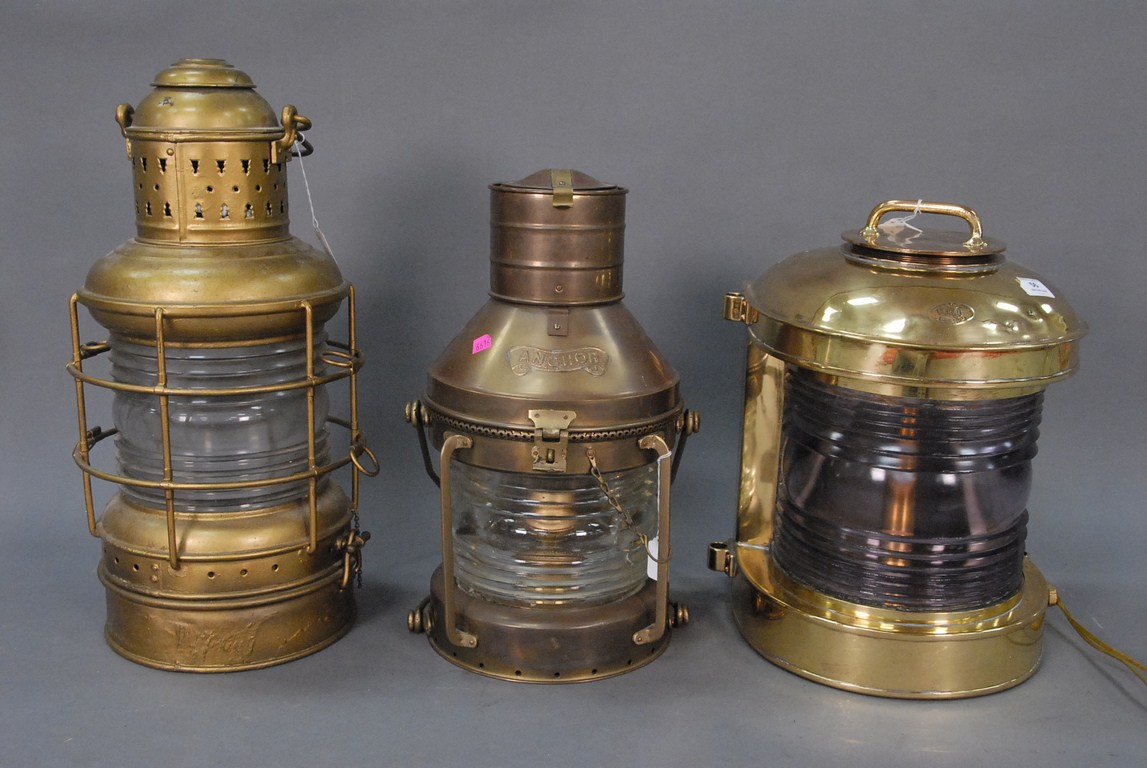 Three large brass nautical ship’s lanterns two are made by Perkins Marine Lamp, Brooklyn, NY Perko and the other mounted with a sash marked Anchor with swing. hts. 17in., 18in., & 22in.
