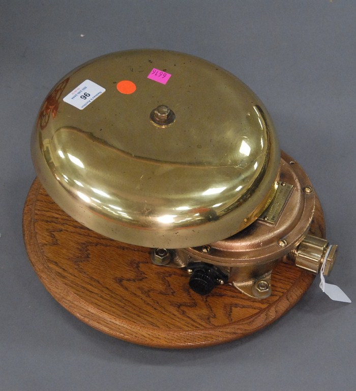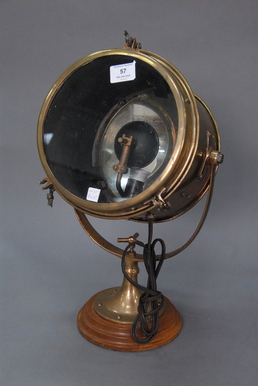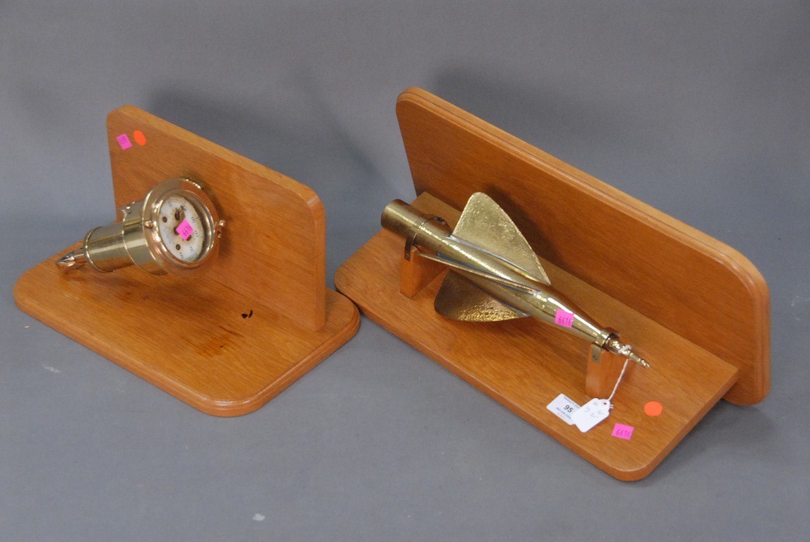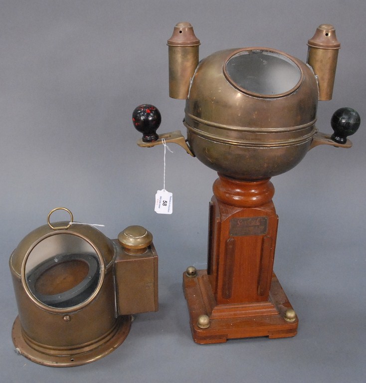 Two brass Sestre Binnades with compass on the inside, one having one side light other with two side lights and the compass marked Bergen Nautik on wood base. hts. 21in. & 10in.