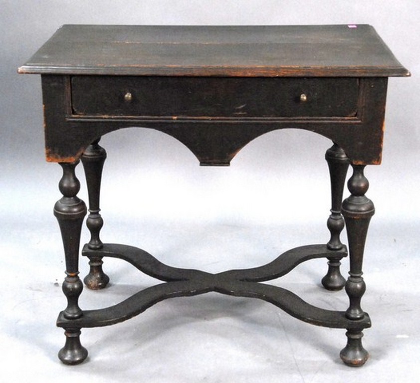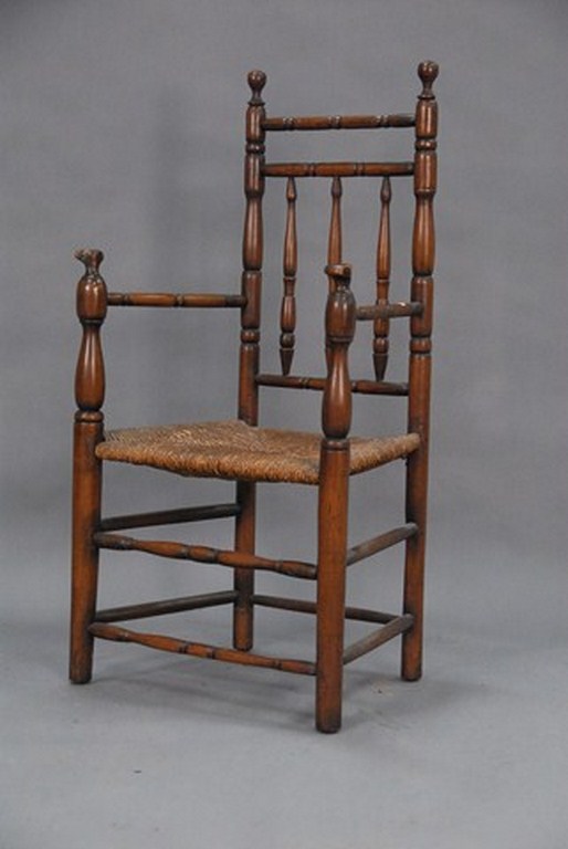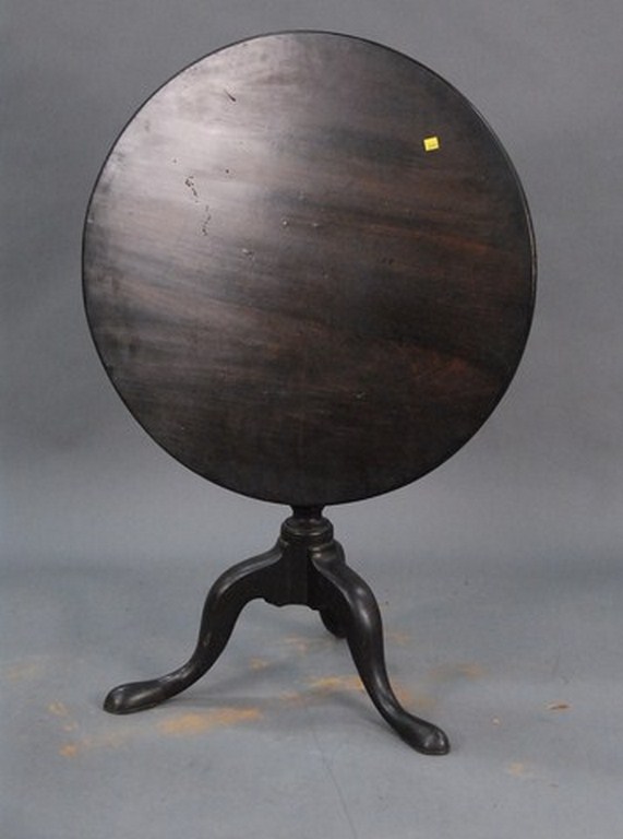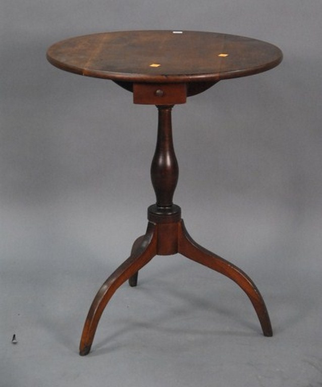 Connecticut cherry candlestand having circular top with candle drawer beneath, set on ring and bulbous turned shaft, three arch-carved legs restored. ht. 26in. dia. 21in.