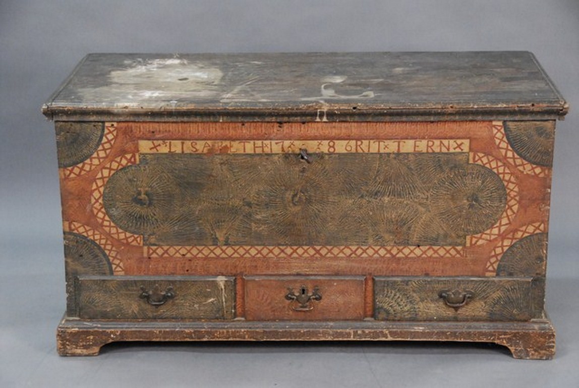 Primitive blanket chest having lift top and three drawers on cut out bracket base and original paint decoration, marked Lisabeth Rit Tern 1786, poplar and oak, 18th century. ht. 27in. wd. 48in. dp. 23in.