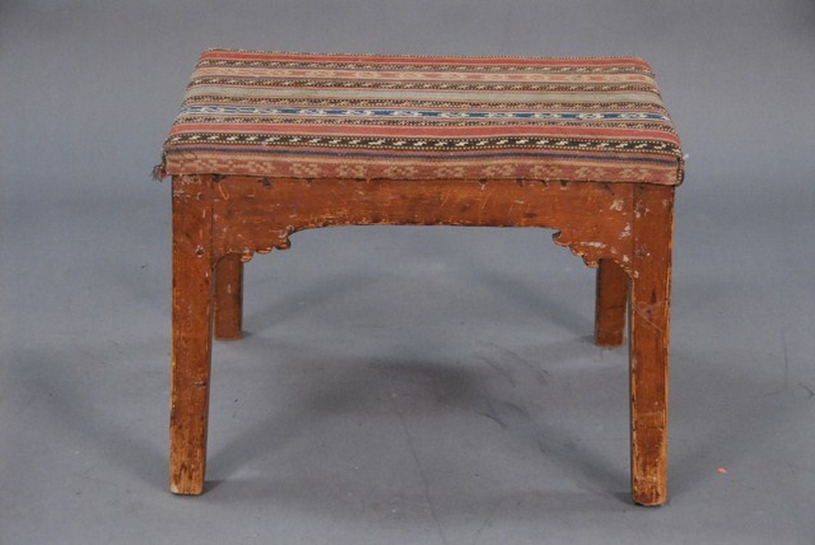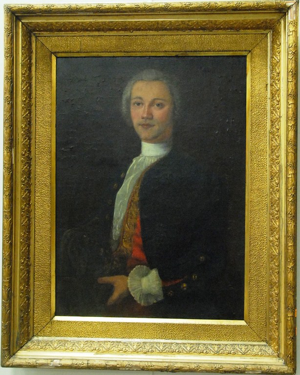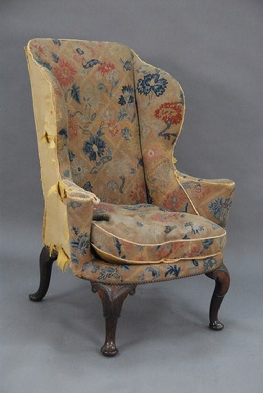 George II upholstered wing chair with early needlepoint upholstery on cabriole legs ending in pad feet. seat ht. 19in. Being sold to benefit a Connecticut Museum.
