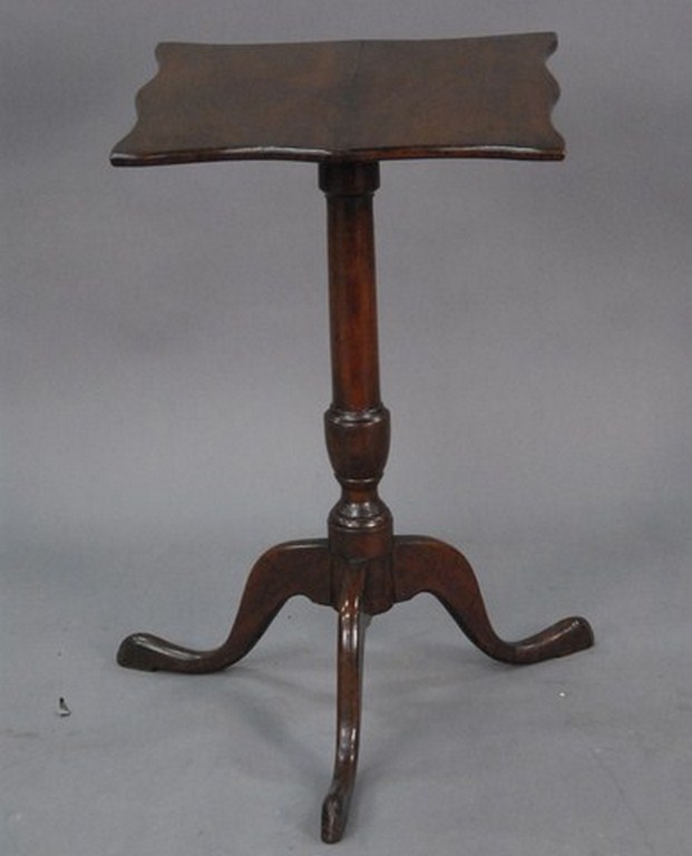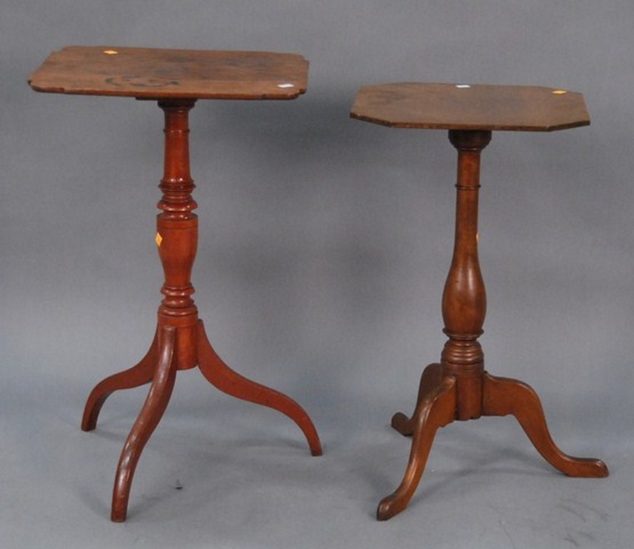 Two piece lot Connecticut cherry candlestand having squared canted corner top turned shaft, set on three arch-carved legs ending in slipper feet and a Connecticut Hepplewhite cherry and mixed hardwood candlestand with thin squared top having unusual shaped and carved corners, turned shaft, raised on three arch-carved tapered legs. Circa 1800. ht. 28in. top: 16 1/2 x 17 1/2 & ht. 26in. top: 16 x 15