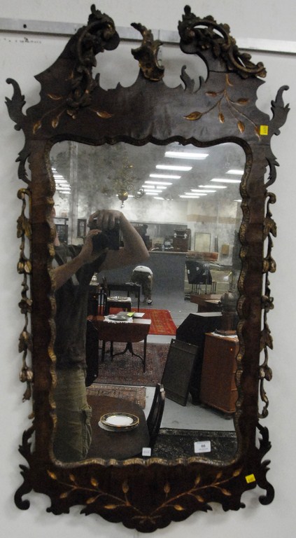 Chippendale mahogany mirror with pediment top and old glass flanked by gilt fruit, 18th century. ht. 48in. wd. 35in. Provenance: Estate of Judy McDonough Gengras of Stoner Drive, West Hartford, Connecticut.