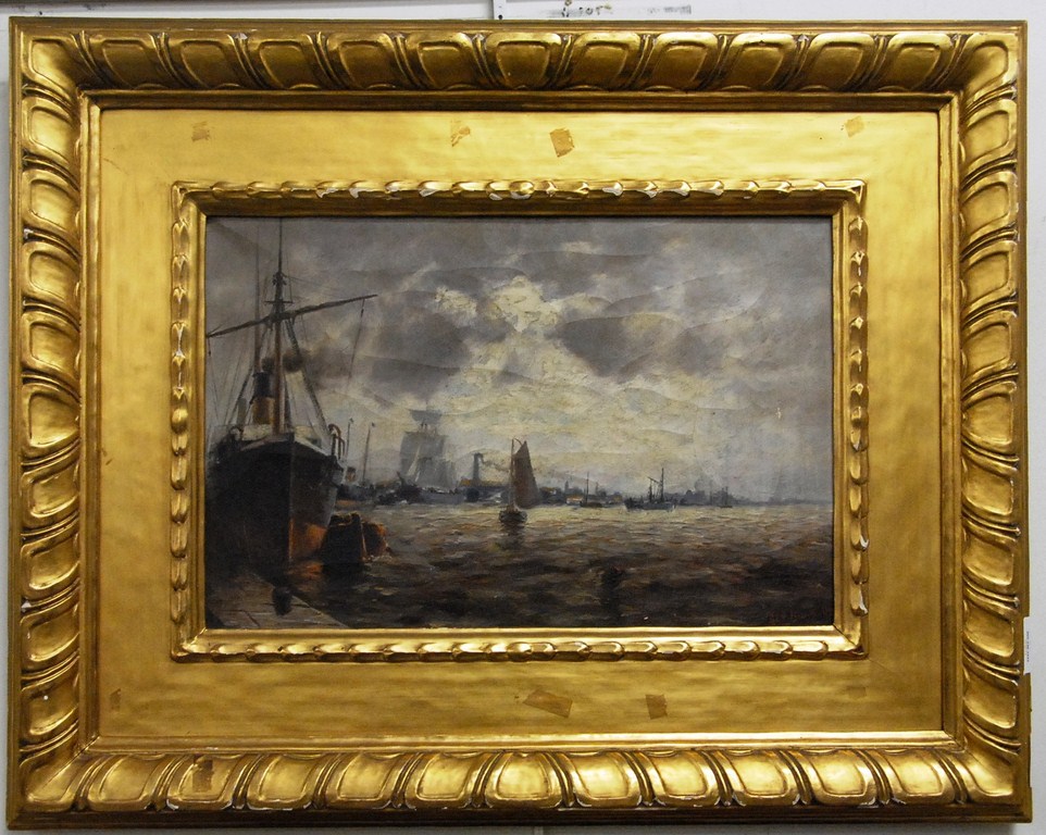 George Burr 1885-1898 STORMY SEAPORT oil on canvas signed lower right Geo. Burr 90 12 x 18 framed in a signed Thulin 1914 #41 frame Provenance: Estate of Charles Archibald Goodwin and Ruth Cheney Goodwin.