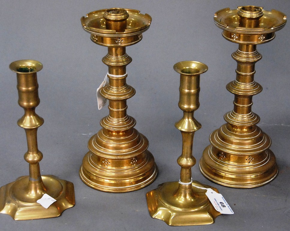 Four piece lot pair of Queen Anne brass candlesticks having flared bobech, set on square stepped bases, deaccession marks on base mid 18th century, east coast museum and a pair of Continental heavy bronze candlesticks.
