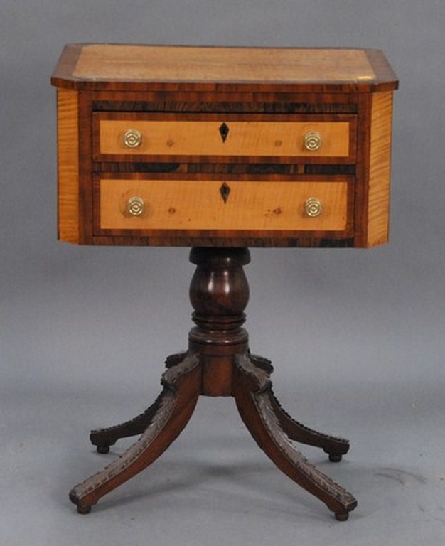 Federal cherry tip stand with shaped top on turned shaft with urn on tripod base. ht. 27in. top: 17 x 17 Provenance: Estate of Judy McDonough Gengras of Stoner Drive, West Hartford, Connecticut.