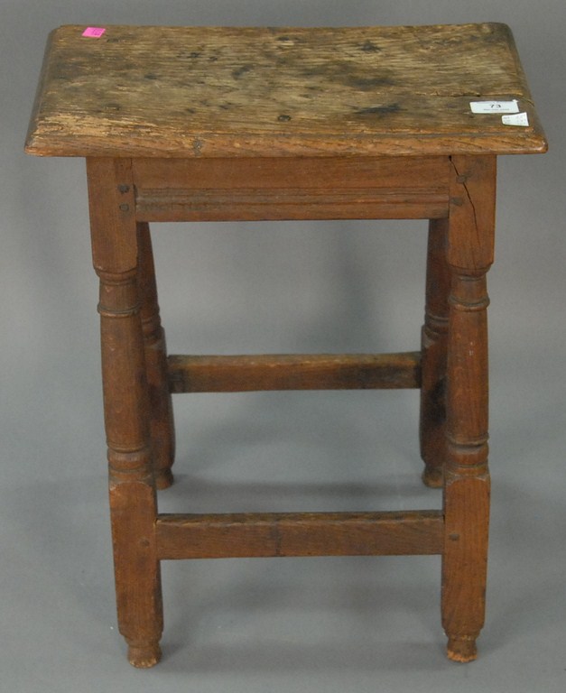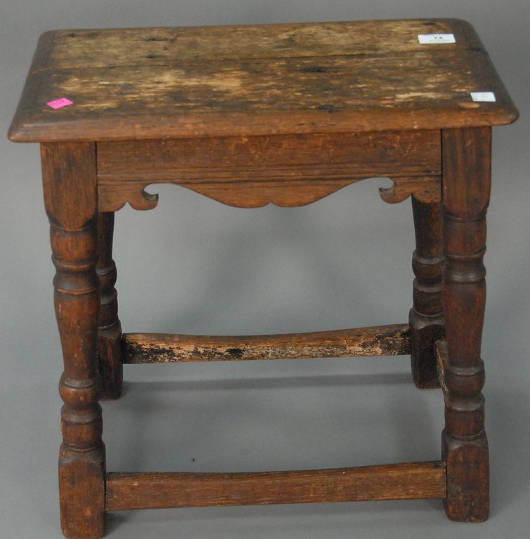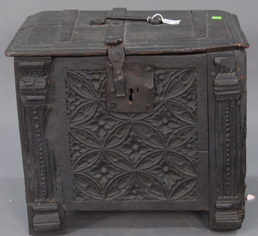 Jacobean lift top box with carved panels, oak, probably 17th century one foot replaced. ht. 14in. wd. 16in. dp. 11in. Being sold to benefit a Connecticut Museum.