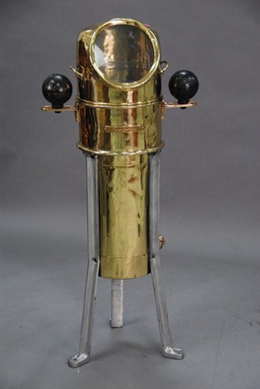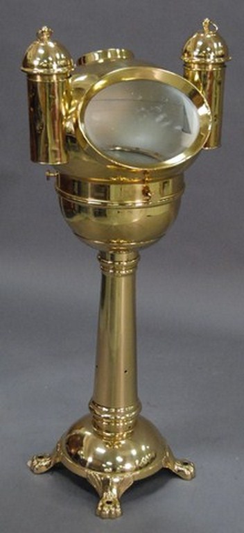 Large brass yacht binnacle marked Ritchie Boston patented Aug 17, 1875, side lighted housing fluid lamp sitting on a tall brass base with claw feet. ht. 43in.