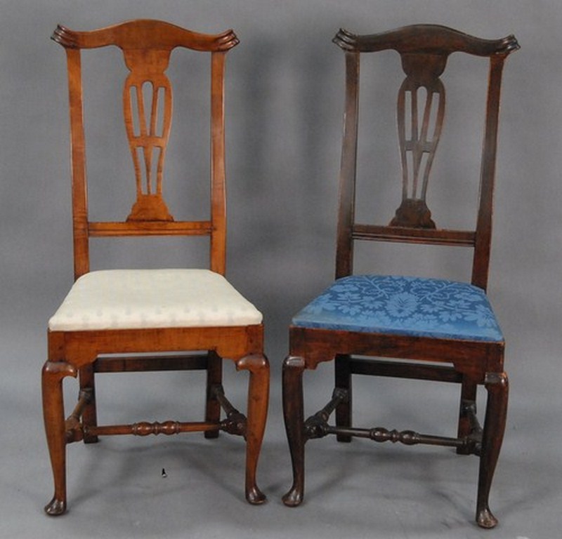 Pair of maple Queen Anne side chairs with pierce carved splats, cabriole legs ending in pad feet and slip seats, one in old grain finish, circa 1760. seat ht. 18in. back ht. 41 1/2in. From the collection of Thomas and Alice Kugelman