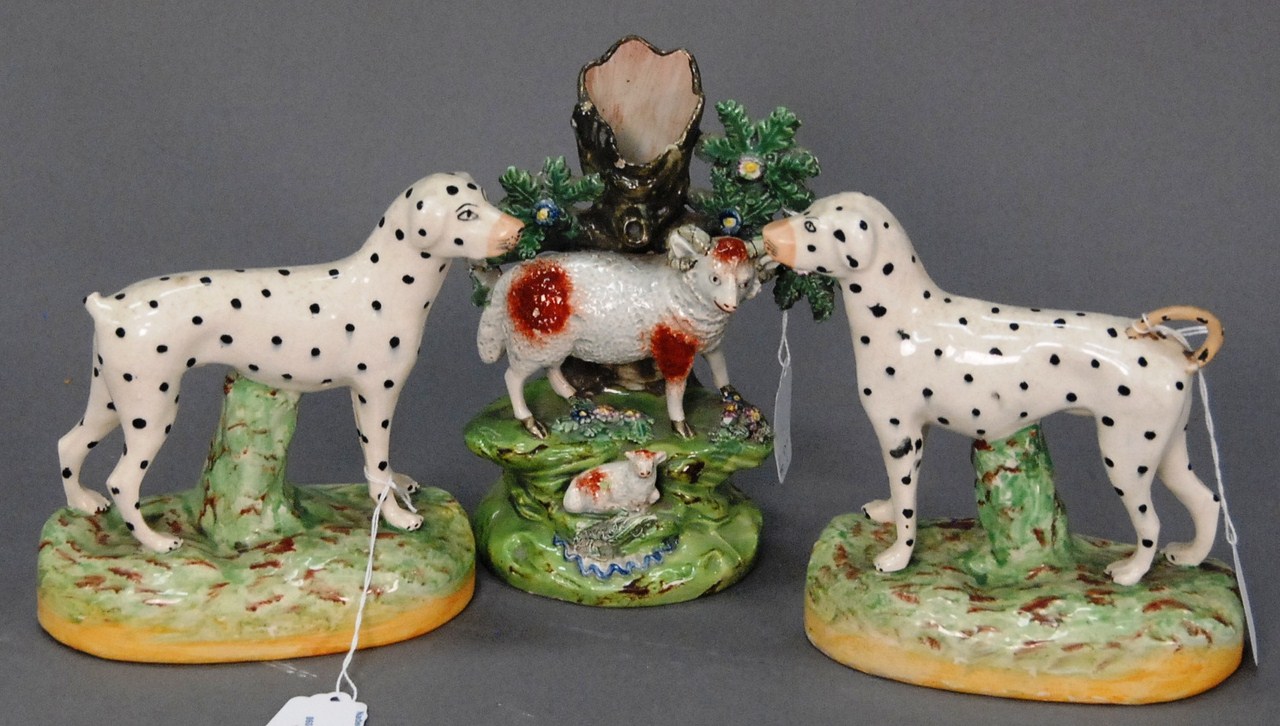 Three piece Staffordshire lot pair of spotted dogs and ram vase marked Walton some lot damage. Provenance: Estate of Charles Archibald Goodwin and Ruth Cheney Goodwin.