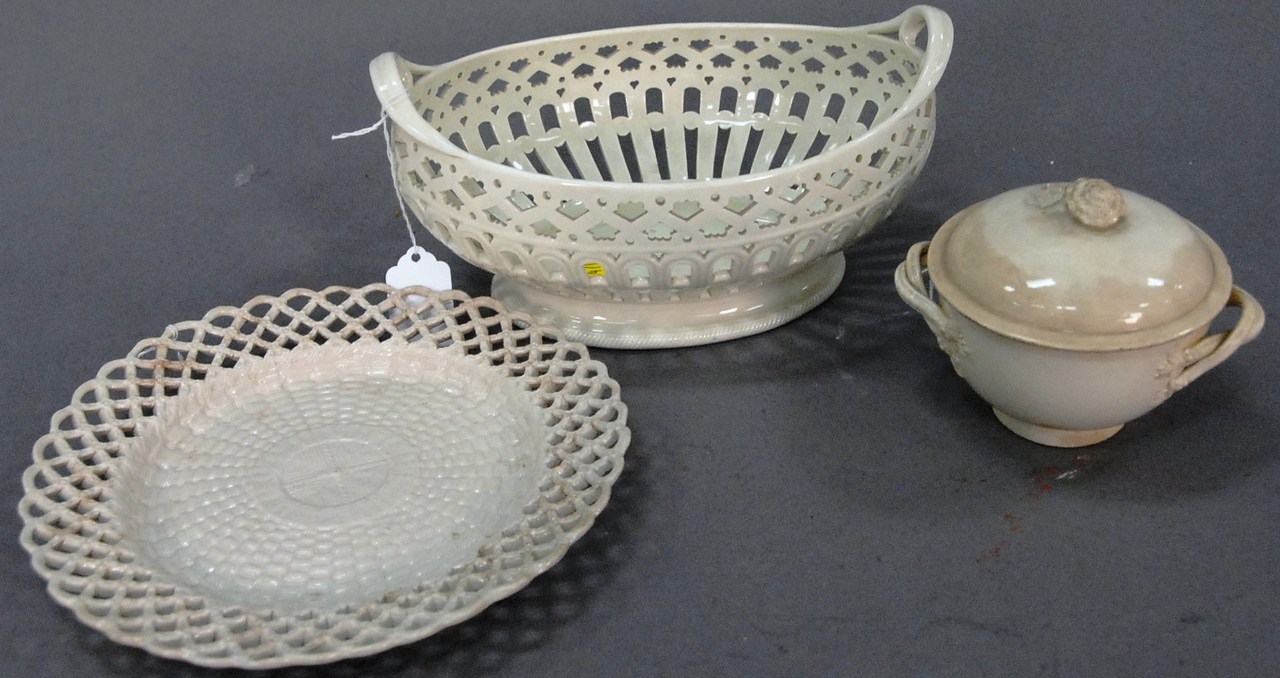 Three piece soft paste lot reticulated bowl, reticulated underplate, and covered sugar, 19th century. Provenance: Estate of Charles Archibald Goodwin and Ruth Cheney Goodwin.