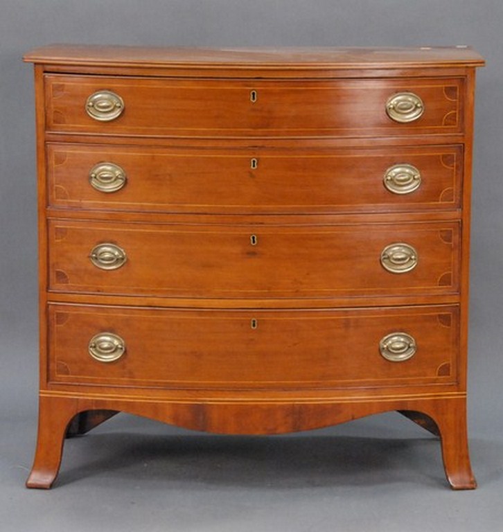 Connecticut Hepplewhite cherry bowfront chest with banded inlaid overhanging top, four graduated drawers with mahogany quarter corner inlay, connected by boxwood string inlay with oval brass pulls, deep shaped banded inlaid apron, raised on high flared French feet. Fourth quarter 18th century, back of chest w/early ownership label marked G. R. Swift, 19 Charles St. Boston MA. ht. 36in. wd. 36in.