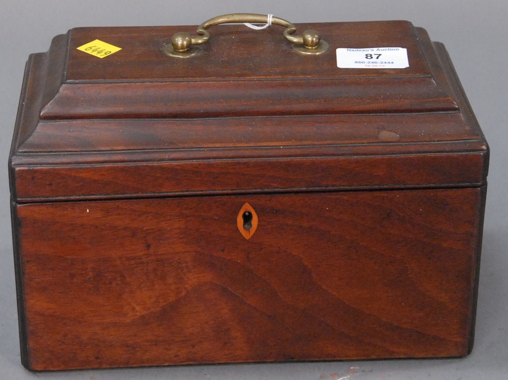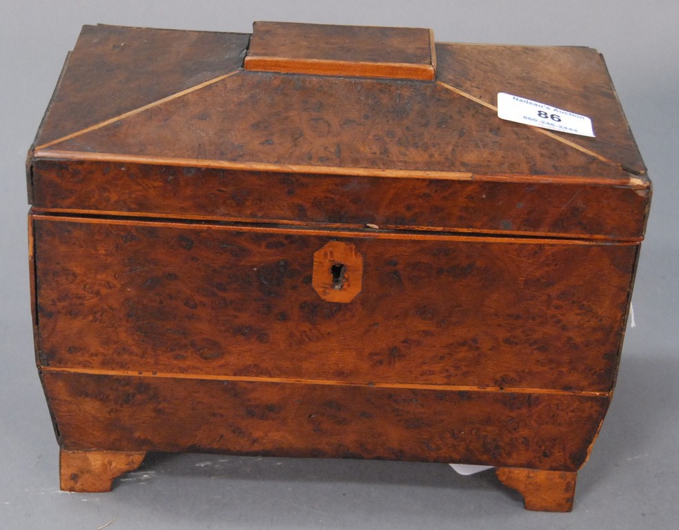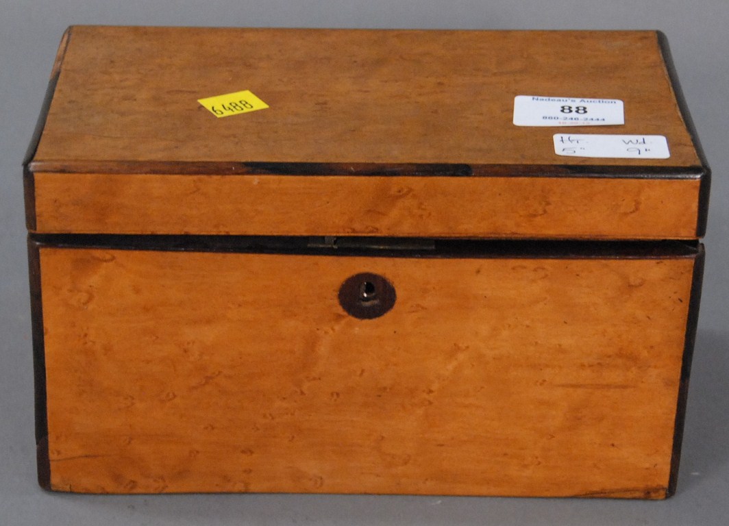 Birdseye maple tea box with two interior covers and inlaid trim. ht. 5in. wd. 9in. Provenance: Estate of Judy McDonough Gengras of Stoner Drive, West Hartford, Connecticut.