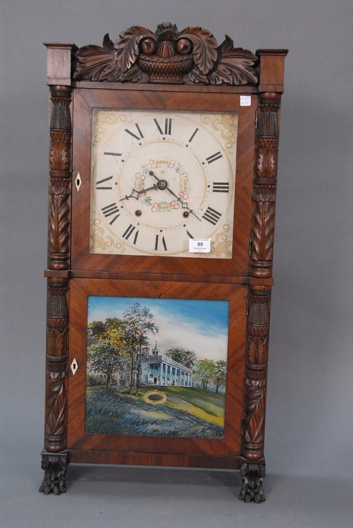 Federal mahogany two part mantle clock with paw feet, M & E Blakeslee. ht. 34 1/2in. wd. 17in. Provenance: Estate of Judy McDonough Gengras of Stoner Drive, West Hartford, Connecticut.