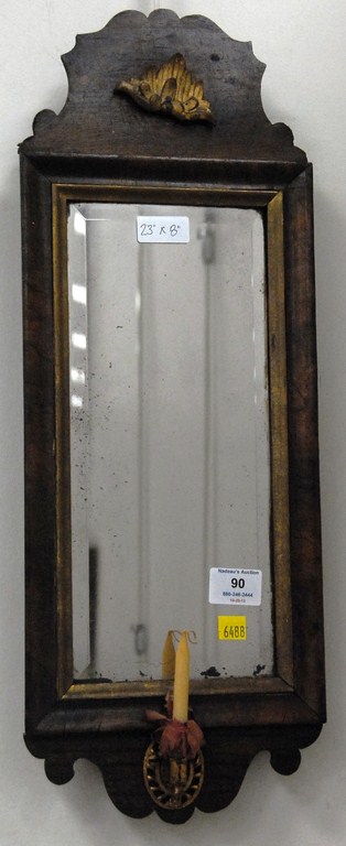 Queen Anne walnut mirror with bevel glass and candle holder with original back board. ht. 23in. wd. 8in. Provenance: Estate of Judy McDonough Gengras of Stoner Drive, West Hartford, Connecticut.