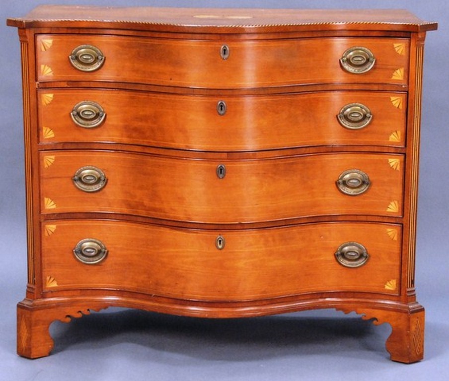 Cherry four drawer chest with exagerated serpentine front, probably Norwich, Connecticut circa 1800, having top with serpentine front and flat block corners over conforming case on cutout bracket feet with carved cusps, top with oval panel, line, and fan inlays, drawers with line and fan inlays, corner with two contrasting inlays, drawers with original oval brass pulls, pine secondary wood. ht. 36in. wd. 39in. dp. 21in.