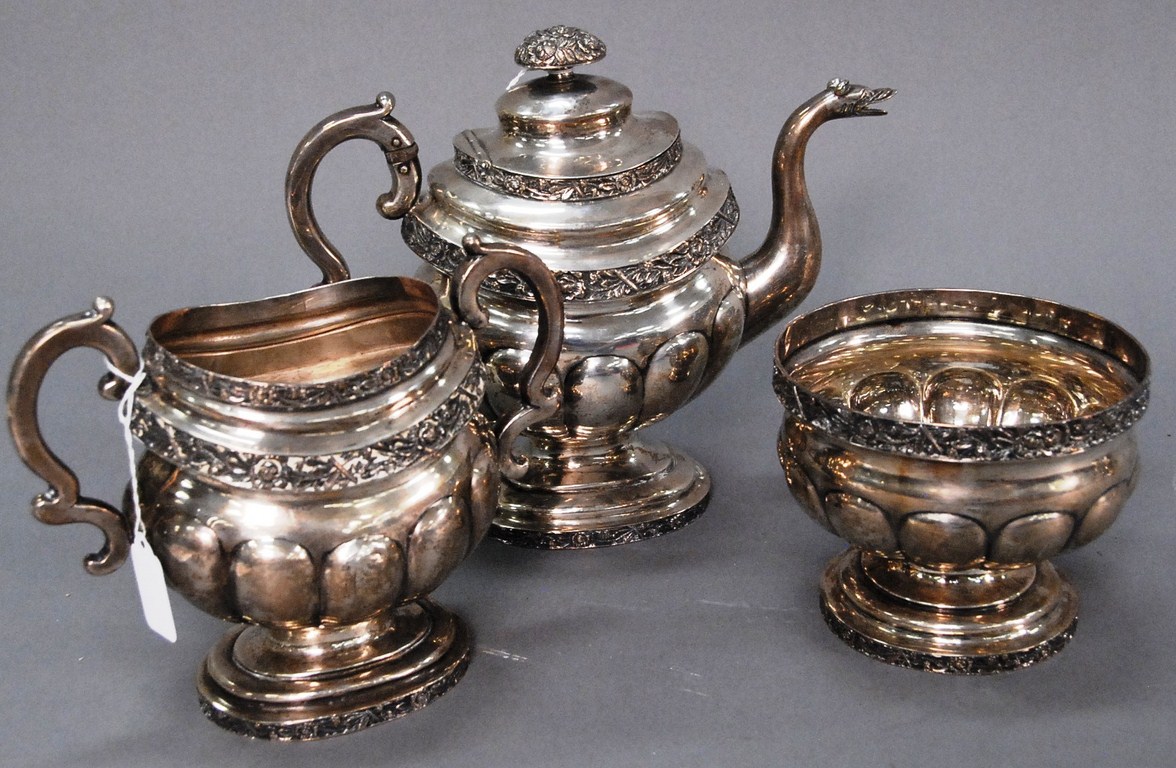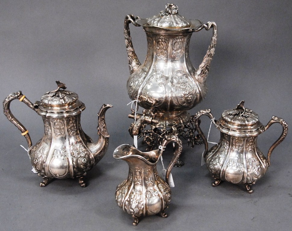 Four piece American Rococo silver tea set including hot water pot with spigot having scallop shell style feet, all with floral finials, grape motif, and floral chasing, signed W. Adams, N.Y. circa 1842. hot water ht: 14 1/2in. 147 t oz.