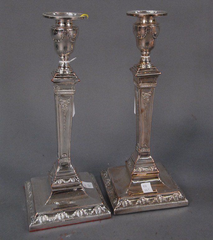 Pair of Sheffield silverplated candlesticks with square bases, 19th century. ht. 11in. Provenance: Estate of Judy McDonough Gengras of Stoner Drive, West Hartford, Connecticut.