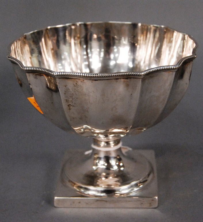 American silver scalloped footed bowl, bead work top and bottom on pedestal set on square base attributed to John Adam Alexandria VA 1790-1798, closely related to footed bowl in Mabel Garvan Collection. ht. 5 3/4in dia. 6 3/4in. 14.4 t oz.