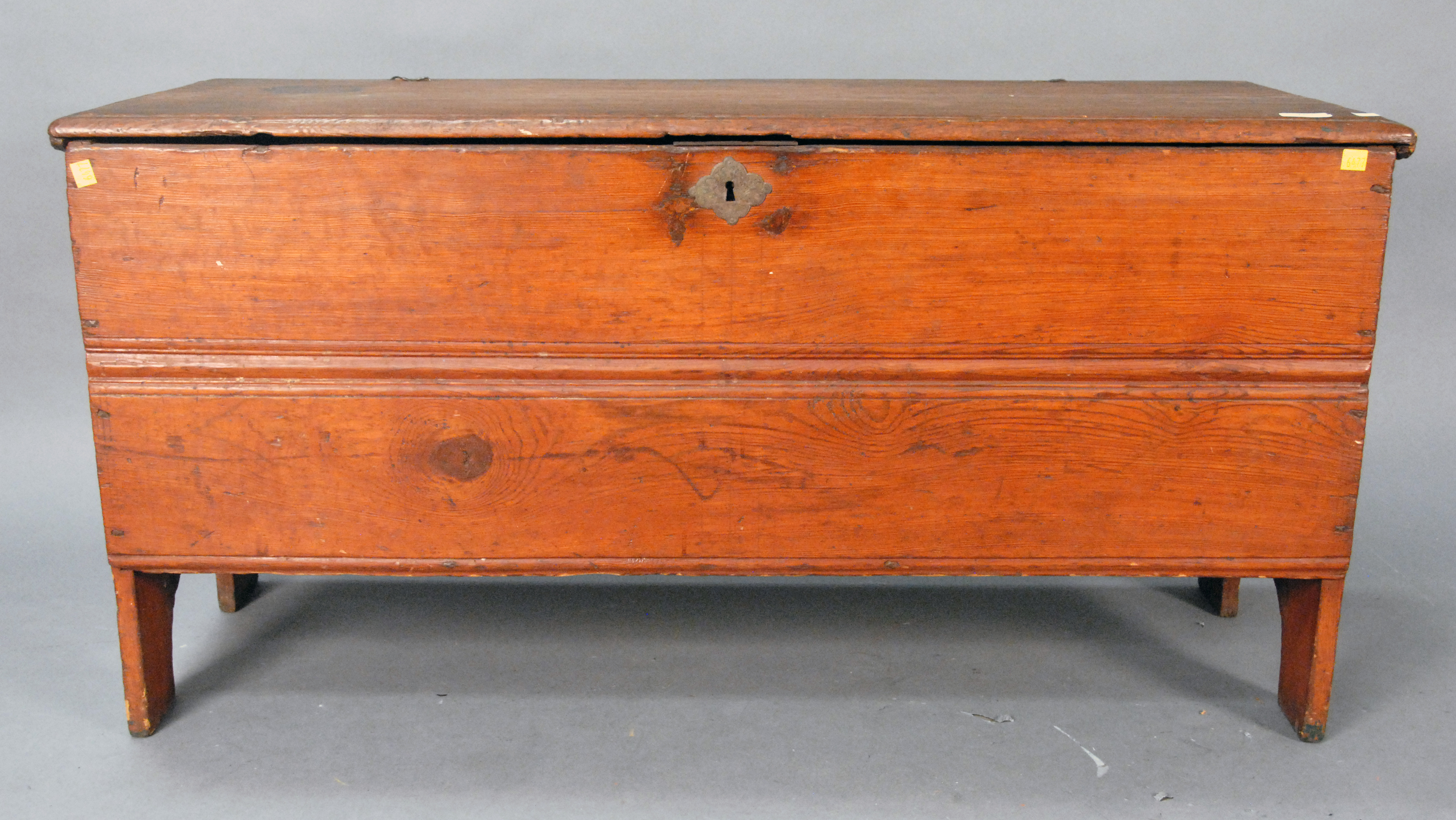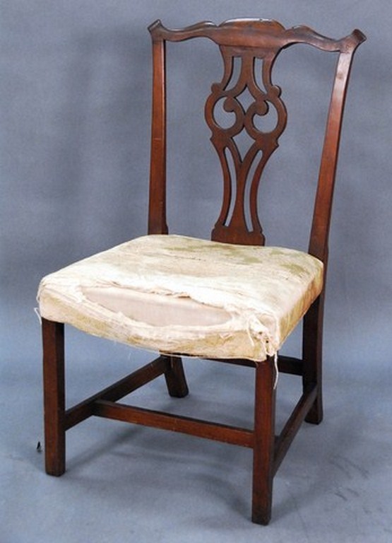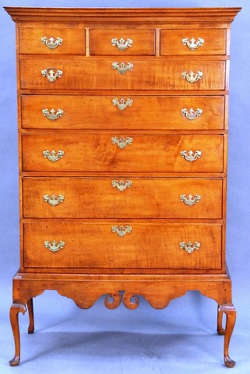 Maple chest on frame, probably New Hampshire circa 1750-1760, having cornice molded top over three short drawers over five drawers all set on original base with open scroll and cyma carved base on cabriole legs ending in pad feet and original Chippendale brasses. ht. 60 1/2in. wd. 36 1/2in. dp. 19 1/2in. Provenance: Estate of Judy McDonough Gengras of Stoner Drive, West Hartford, Connecticut.