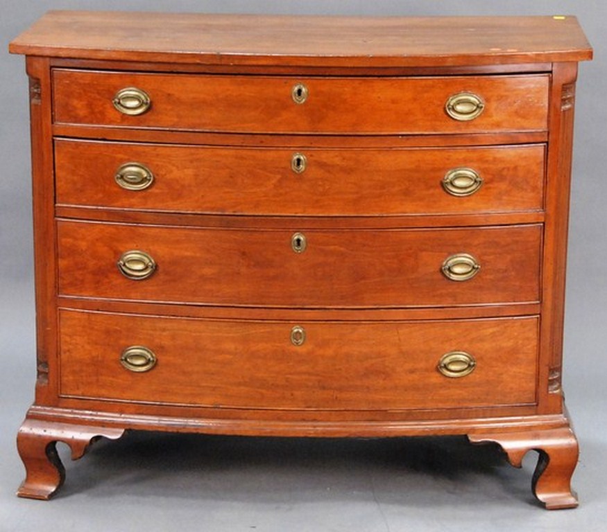 Chippendale cherry bow front four drawer chest with fluted quarter columns set on ogee feet. ht. 36in. wd. 42in. dp. 23in. Provenance: Estate of Judy McDonough Gengras of Stoner Drive, West Hartford, Connecticut.