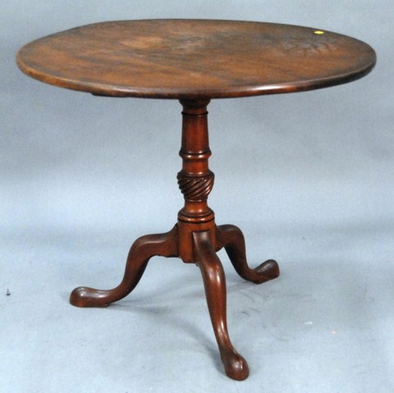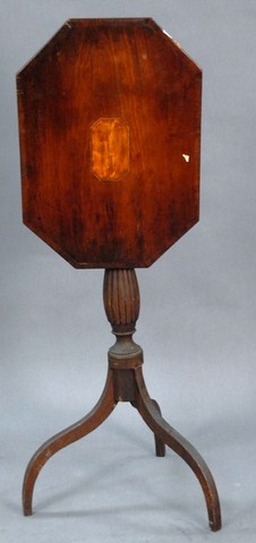 Hepplewhite mahogany candlestand retaining original finish with rectangular canted corner top, set on unusual turned and reeded bulbous pedestal, ending in three arch-carved tapered legs. Fourth quarter 18th century.ht. 31in.