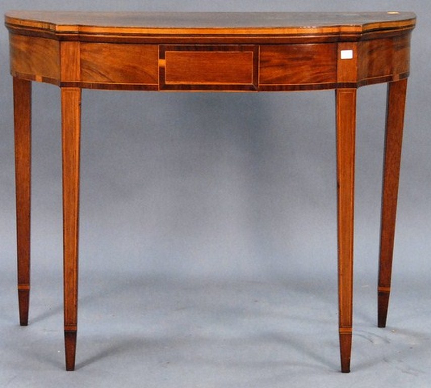 Massachusetts Hepplewhite mahogany card table having bowfront & serpentine ends, satinwood and ebony banding, conforming shaped frieze having a central panel surrounded by sap grain mahogany and boxwood banding, square tapered string inlaid legs having cuff inlay at ankles with excenuated tapering beneath, Boston coastal region circa 1785-1805. ht. 29in. wd. 36in.