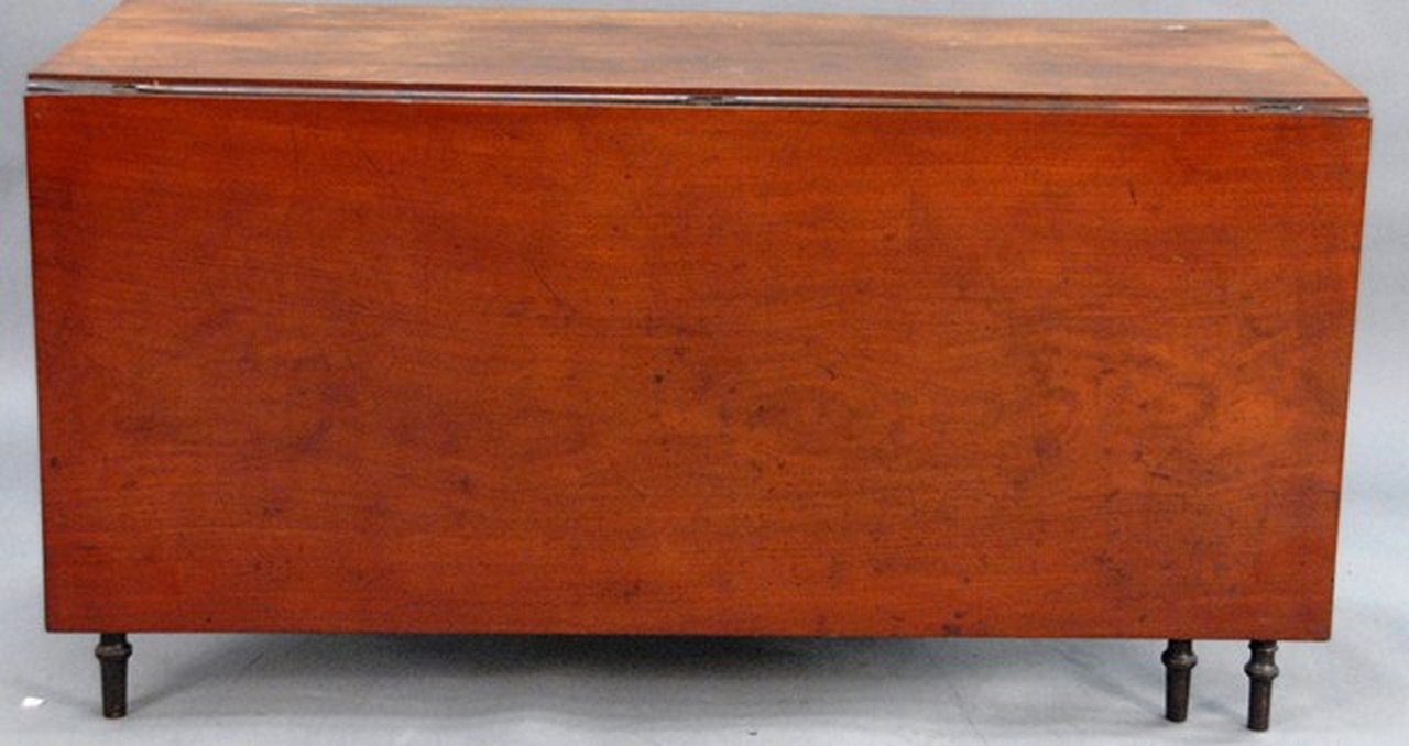 Sheraton mahogany drop leaf table with six feather carved and fluted legs. ht. 24in. open: 47 x 56 closed: 22 x 56 Provenance: Estate of Judy McDonough Gengras of Stoner Drive, West Hartford, Connecticut.