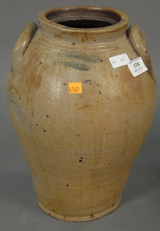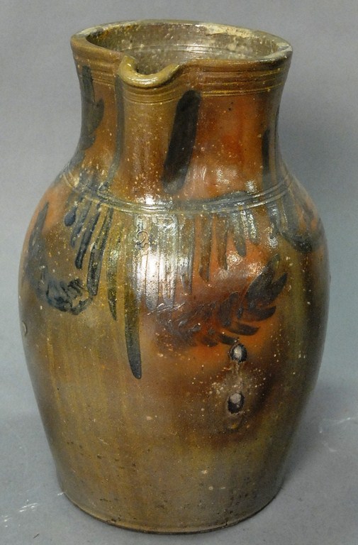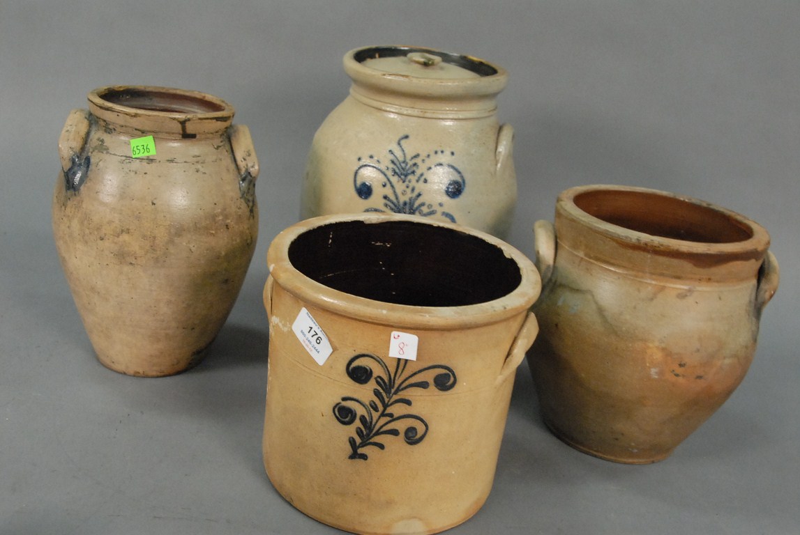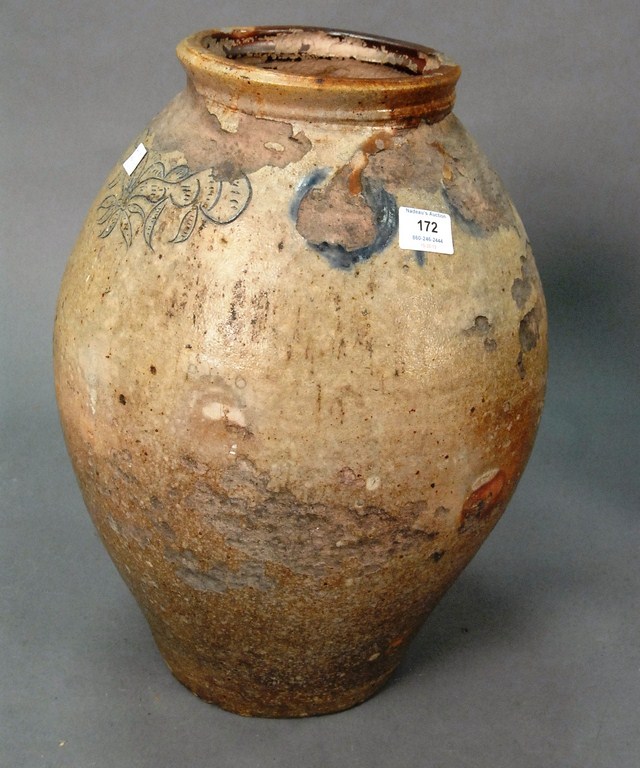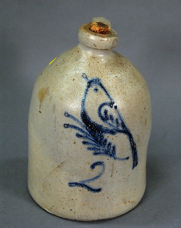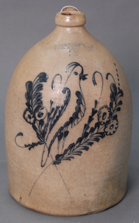 Stoneware three gallon crock with blue decoration of bird and flowers, S.L. Pewtress, Fair Haven, CT. ht. 15 1/2in. Being sold to benefit a Connecticut Museum.