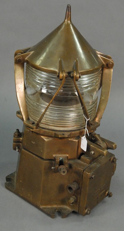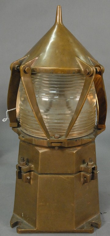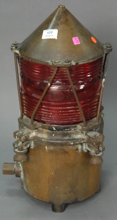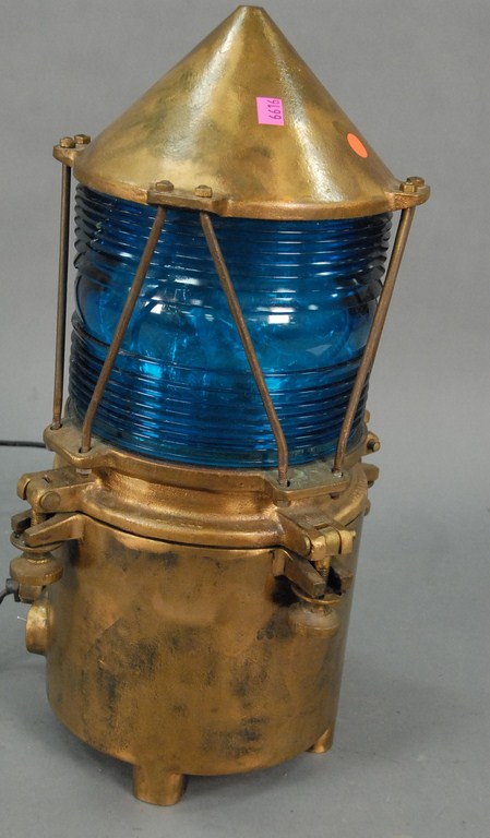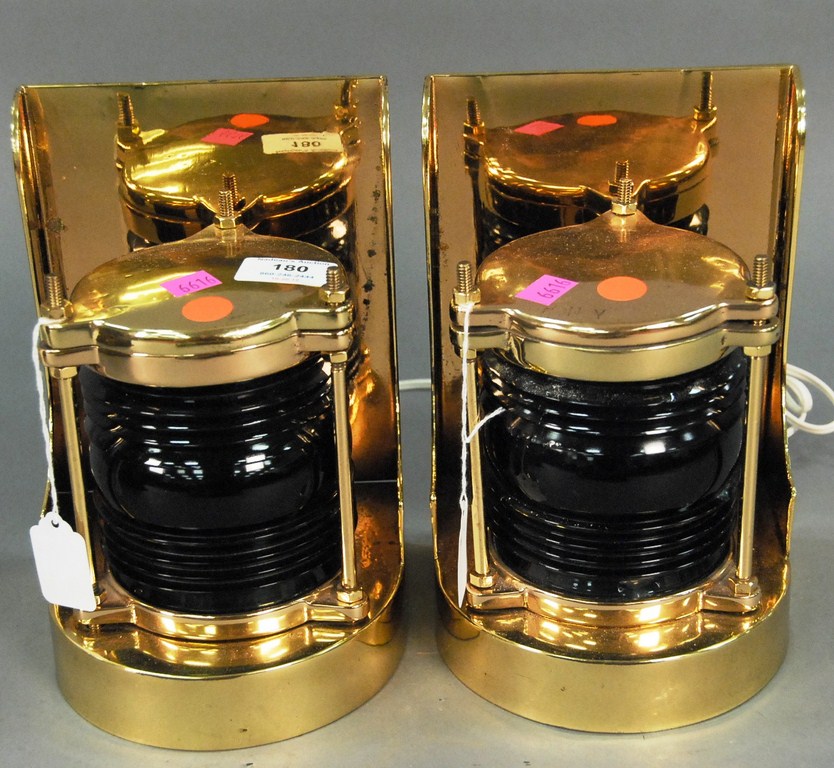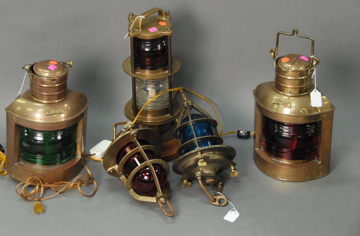 Five piece lot of nautical ship’s lanterns one pair of brass lanterns – one markd Starboard and the other marked Port, pair of bronze hanging lanterns with red and blue green shades, and double red and white lantern. hts. 12in. – 16in.