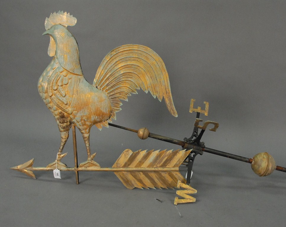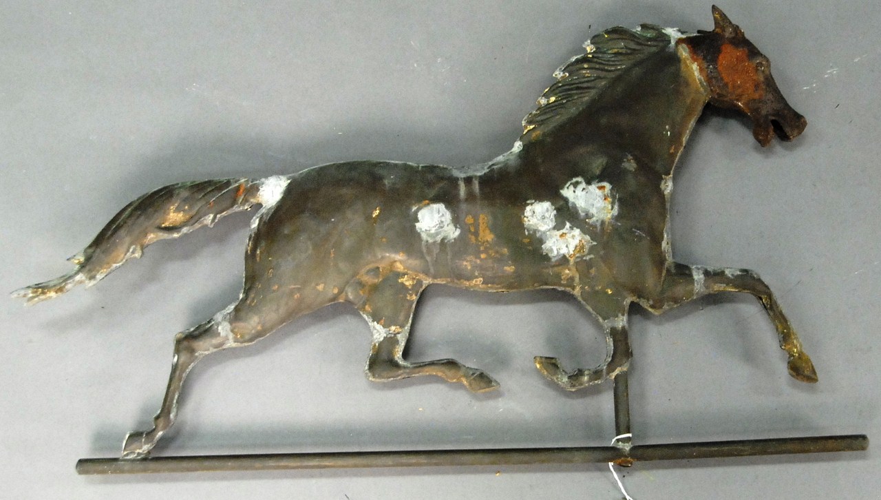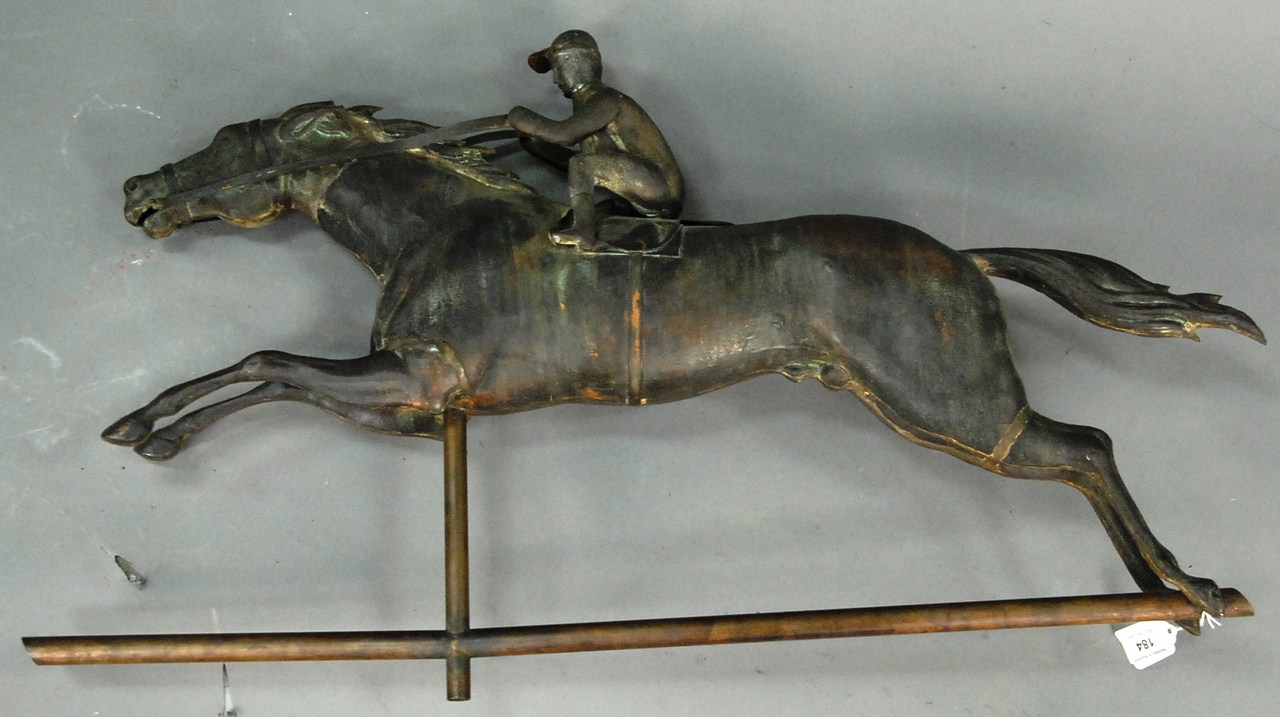 Full bodied running horse and jockey weathervane molded copper with cast zinc heads, probably late 19th to early 20th century. ht. 20in. lg. 33in. Provenance: Estate of Judy McDonough Gengras of Stoner Drive, West Hartford, Connecticut.