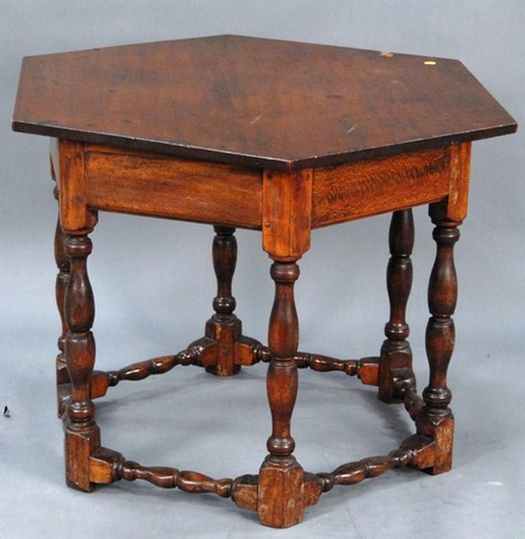 William and Mary octagon table with turned stretcher base replaced top. ht. 24 1/2in top 36 x 30 Provenance: Estate of Charles Archibald Goodwin and Ruth Cheney Goodwin.